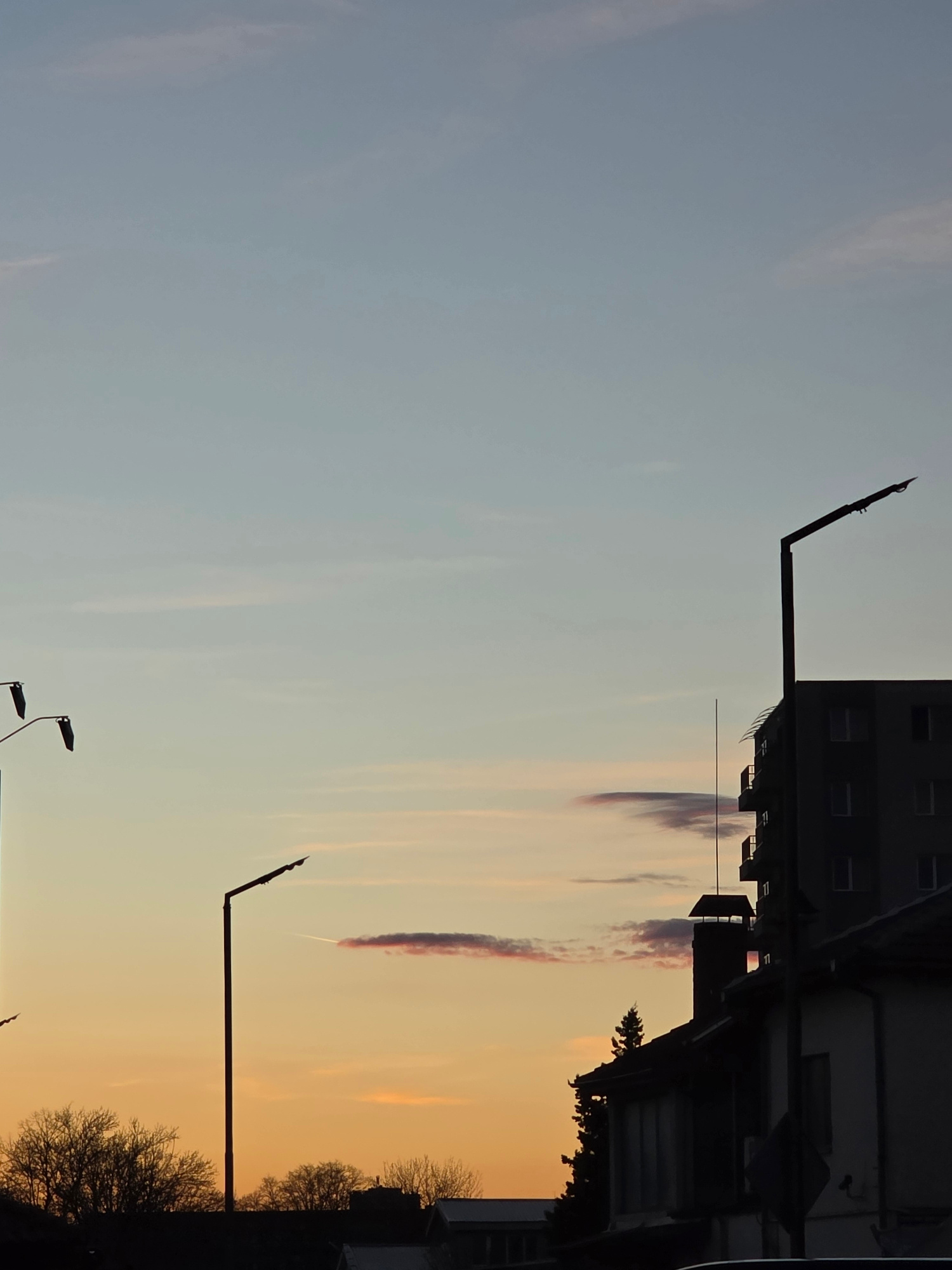 The image depicts a view in the city of Plovdiv, Bulgaria, at dusk. The sky transitions from pale blue in the upper left to orange on the right. A contrail is visible in the orange sky. Silhouetted bu…read more