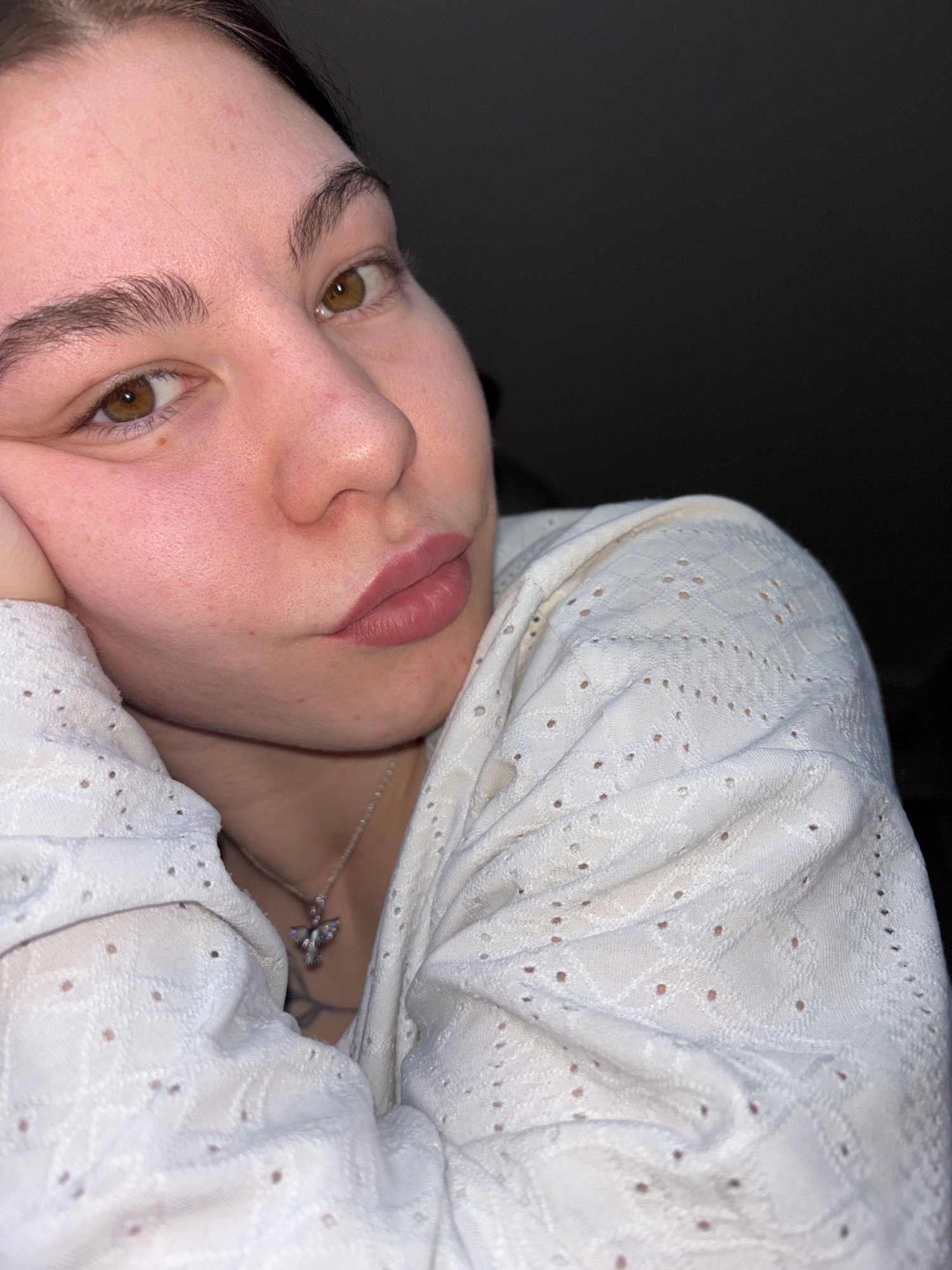 A close-up, low-angle shot depicts a person with fair skin, light brown eyes, and full lips. They are partially covered by a white, patterned garment with small perforations. A silver necklace with a…read more