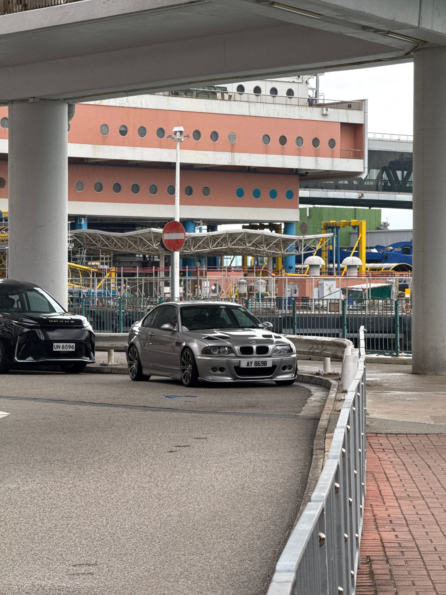 The image shows a street scene in Hong Kong, China. Underneath a concrete overpass, two cars are parked on the side of the road: a silver BMW with the license plate "AY 8698" and a black car with the…read more