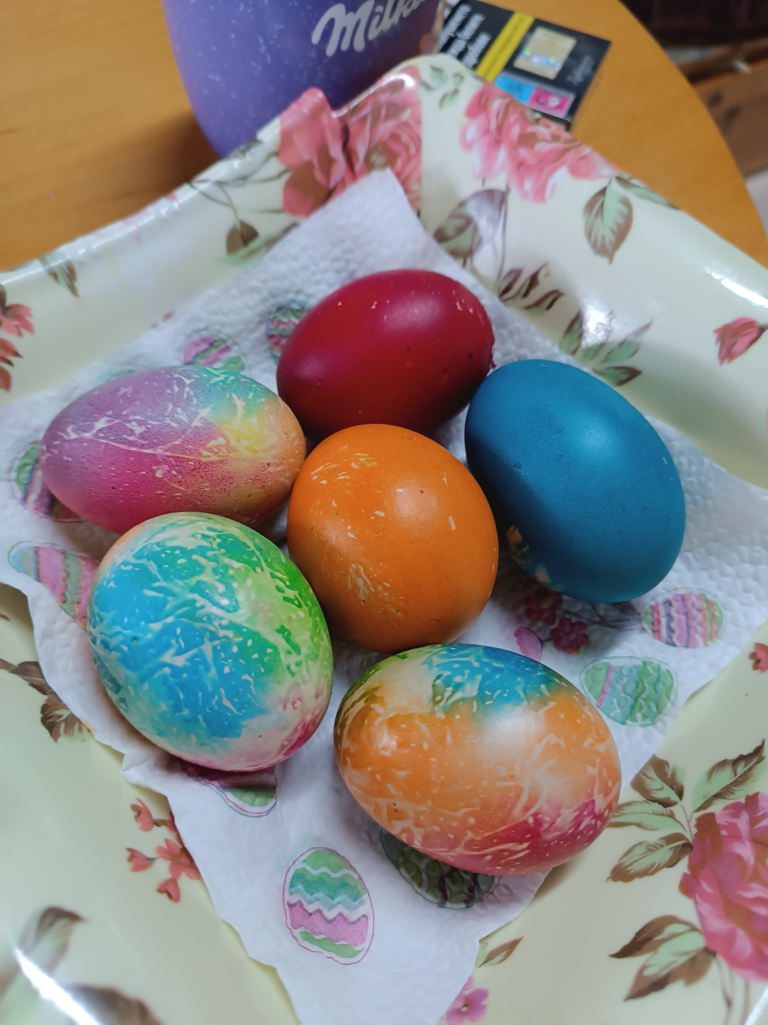 The image shows a close-up of six Easter eggs arranged on a white napkin with Easter egg patterns. The napkin rests on a light yellow tray with a floral pattern. The eggs are dyed in various colors in…read more