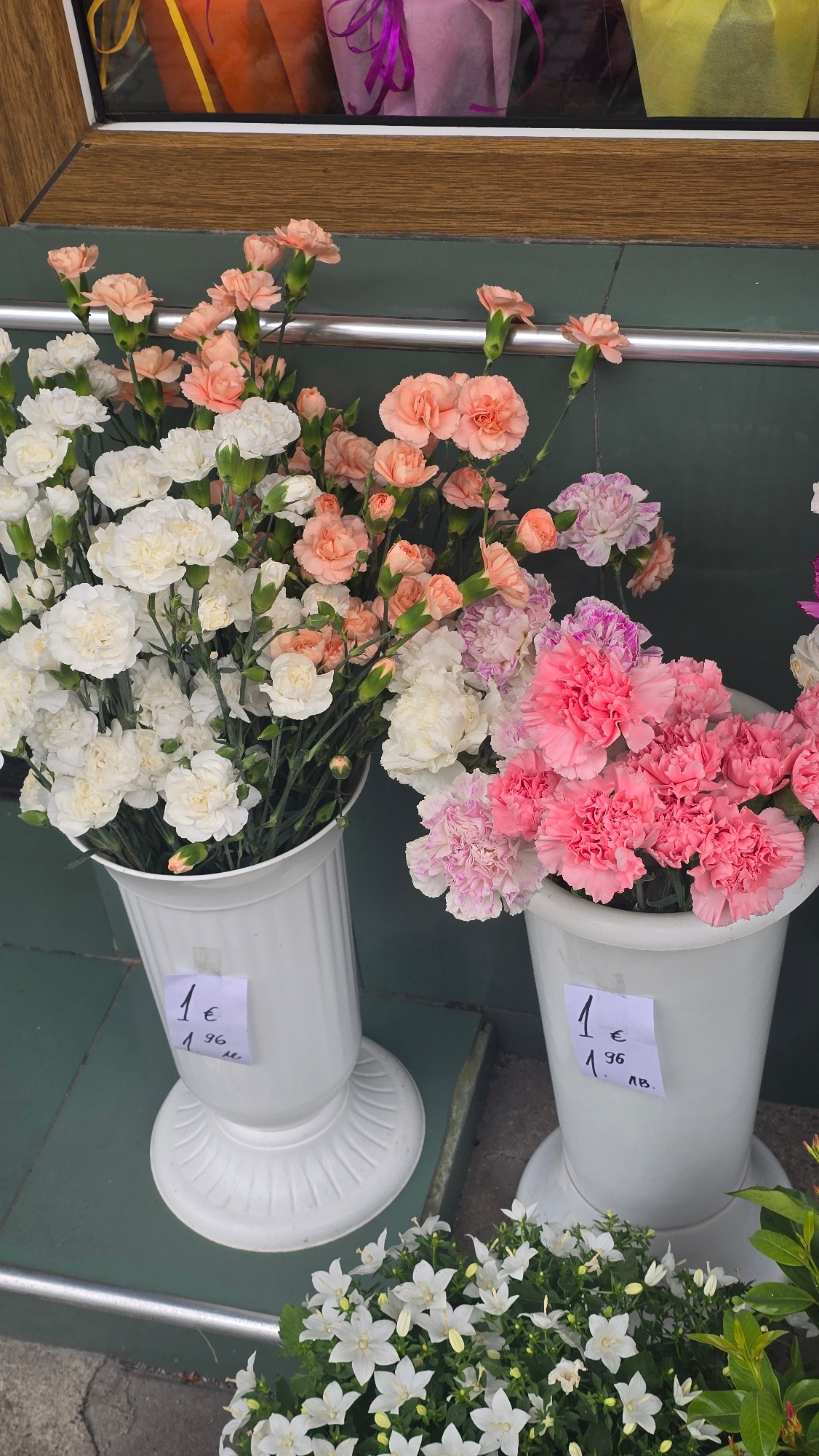 The image shows a flower display in Stara Zagora, Bulgaria. Two white, urn-shaped vases sit on a green surface, each filled with flowers. The top vase contains pink and white carnations. The bottom va…read more