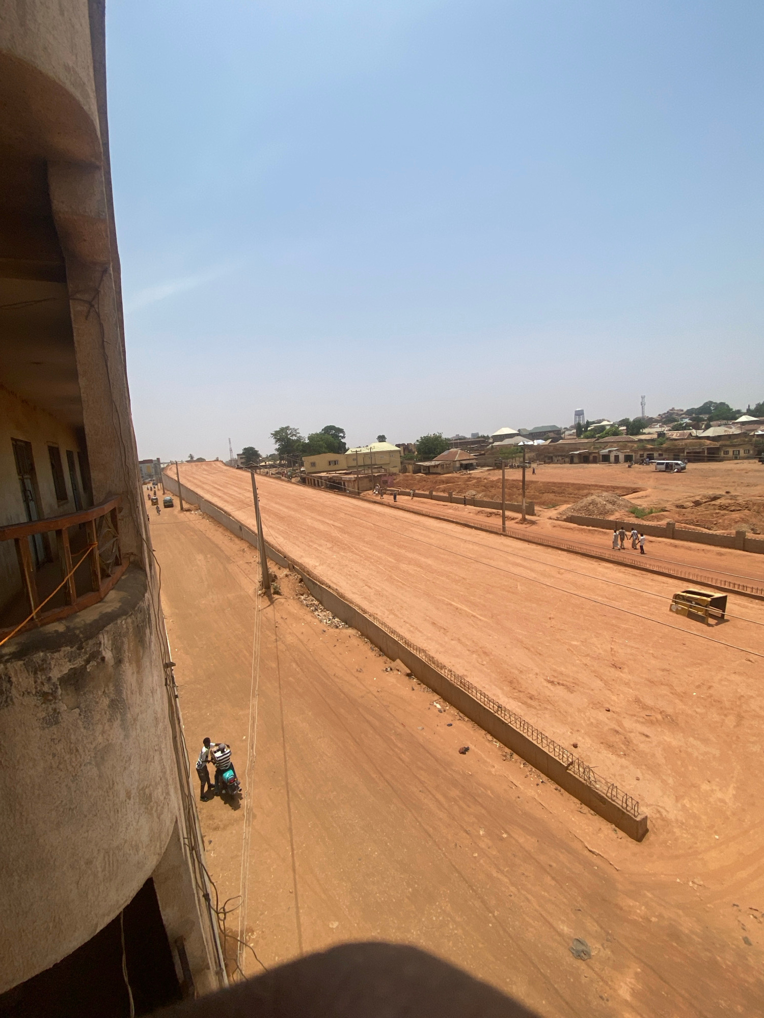 An elevated view looking down upon a wide, dirt road in Tudun Wada, Nigeria. The road is bordered by concrete structures and appears to be under construction. Several people are seen working along theβ¦read more