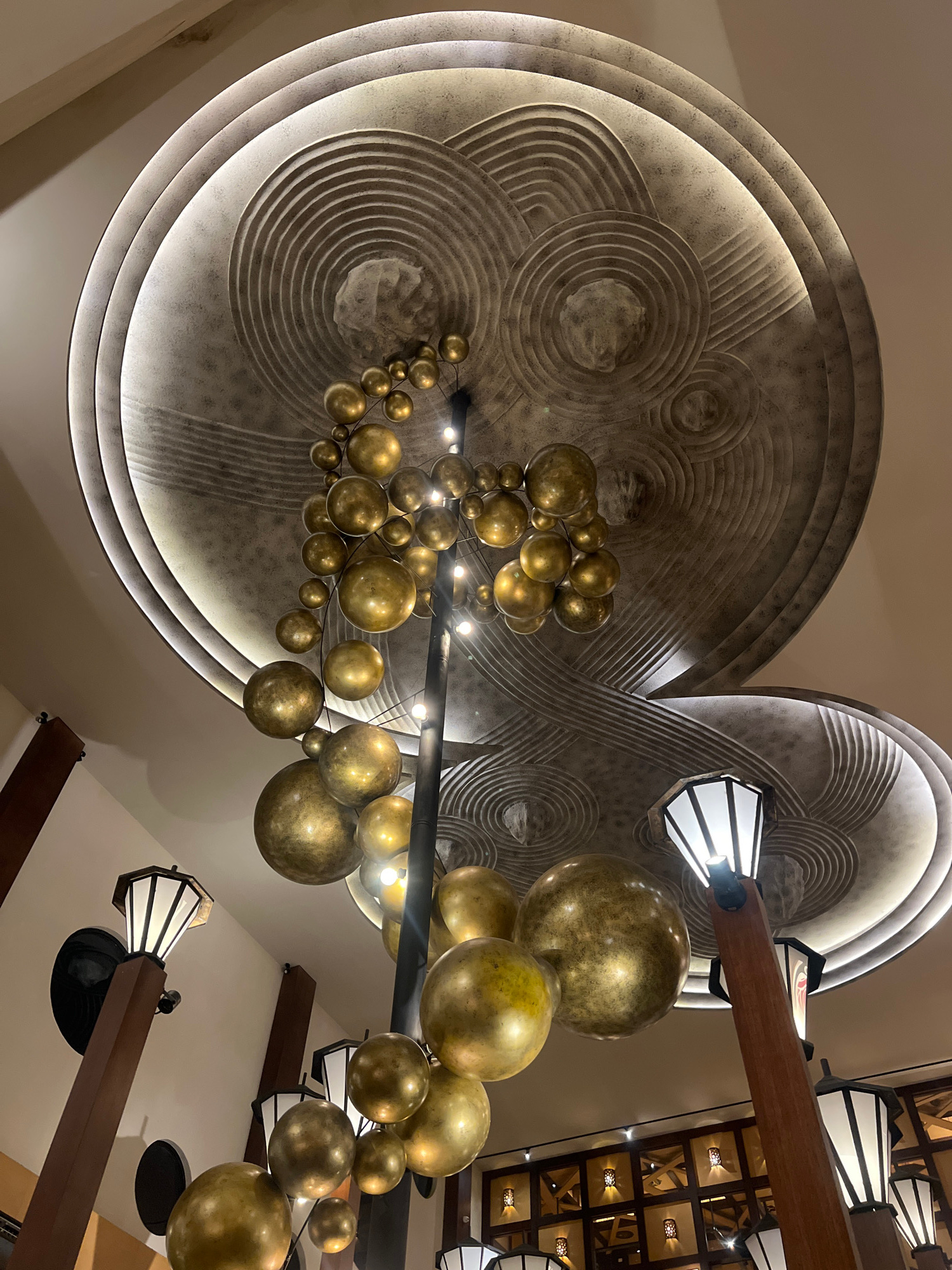 The image shows a view looking upwards at an interior ceiling. Two decorative ceiling elements are present: one is a large circular design with concentric rings, and the other is an adjacent curving d…read more
