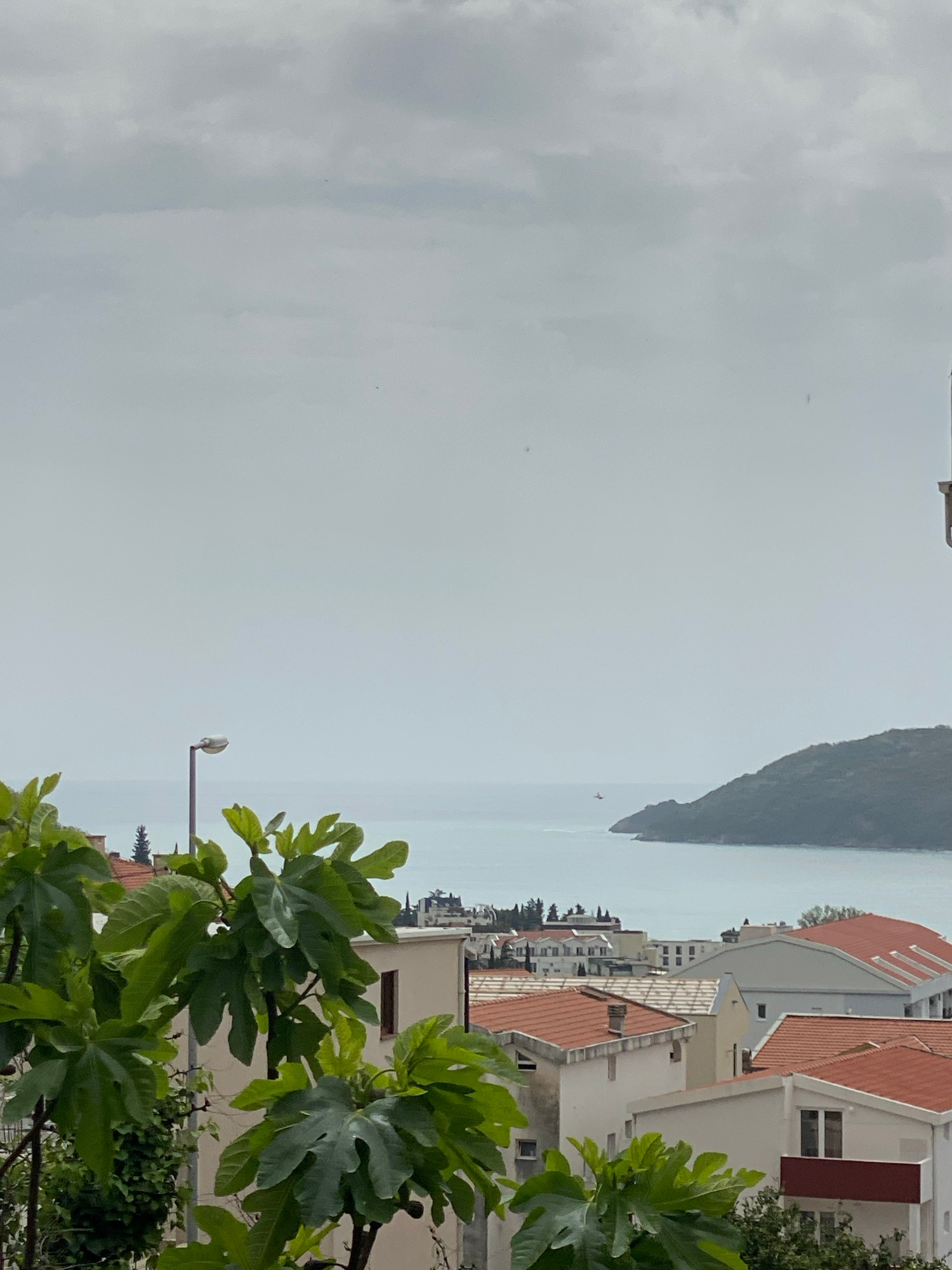 The image shows a view in Budva, Montenegro, overlooking the sea. In the distance, a mountain meets the water. Closer to the viewer are buildings with orange rooftops, interspersed with trees and foli…read more