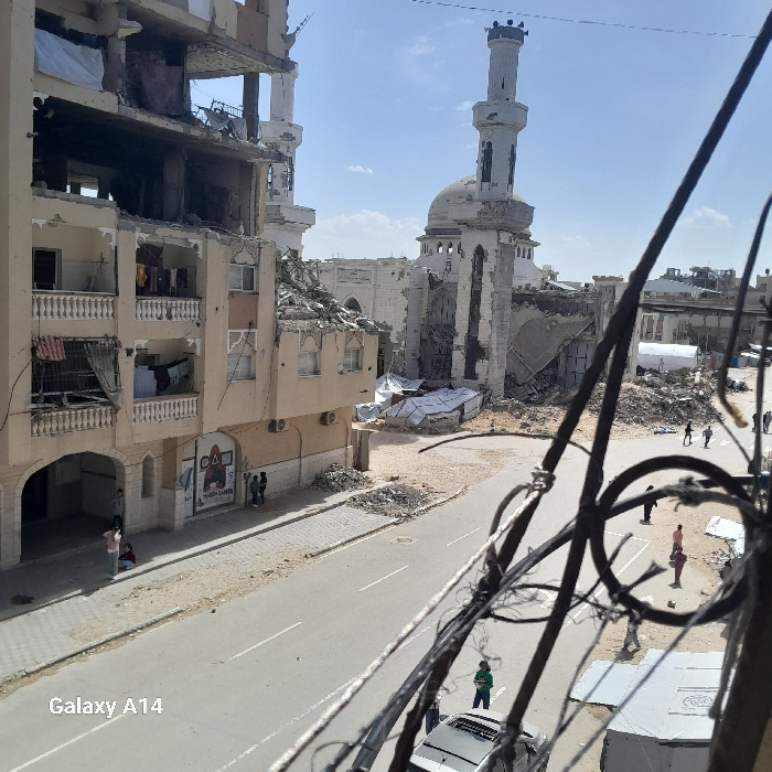 This image depicts a scene of extensive destruction in Khan Yunis, Palestinian Territory. The central focus is a significantly damaged mosque, identifiable by its distinct minaret and dome, both of wh…read more