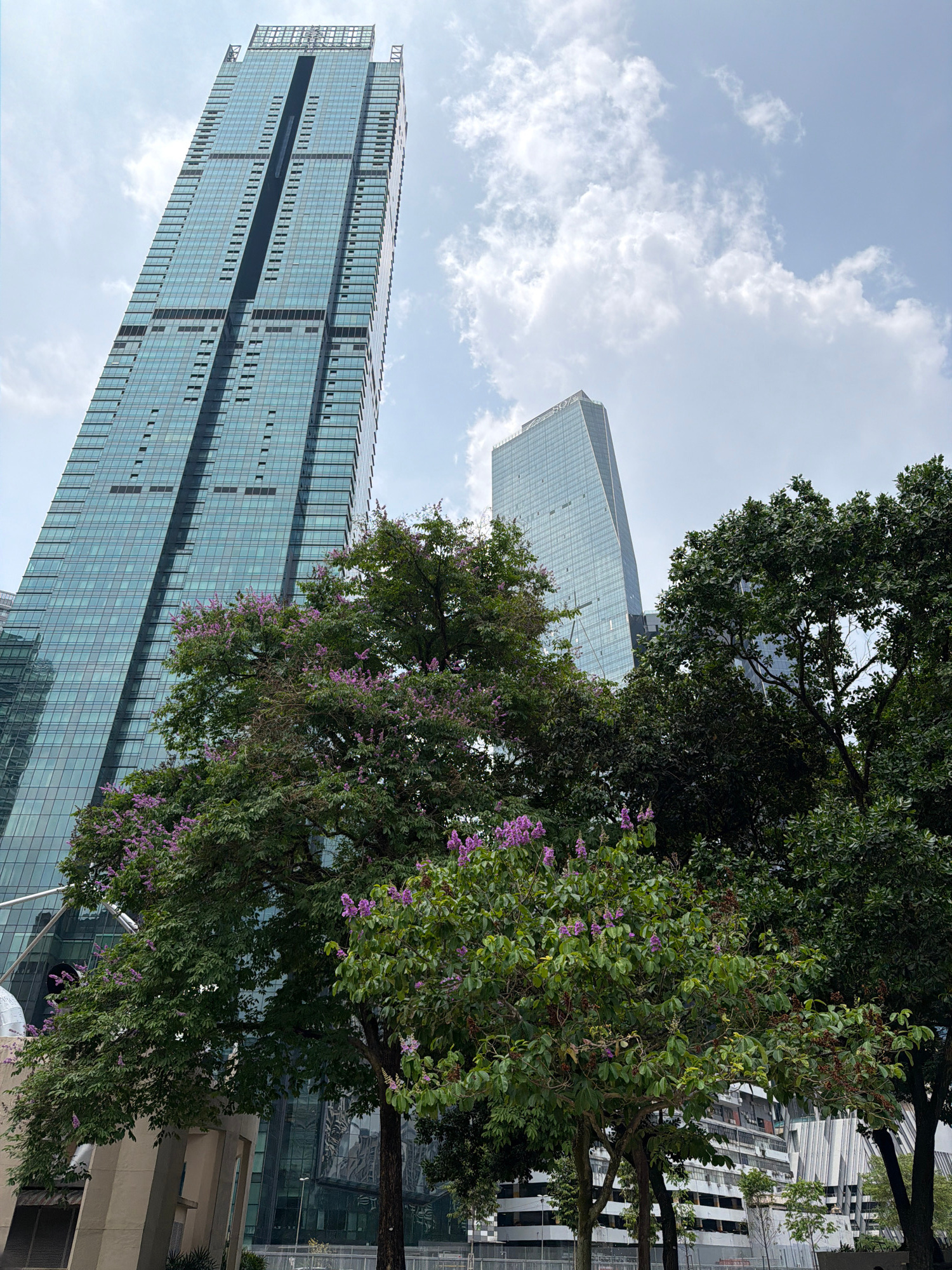 The image captures a view of Kuala Lumpur's skyline, featuring two prominent skyscrapers against a backdrop of a cloudy sky. On the left, a tall, modern building with a glass facade dominates the fram…read more