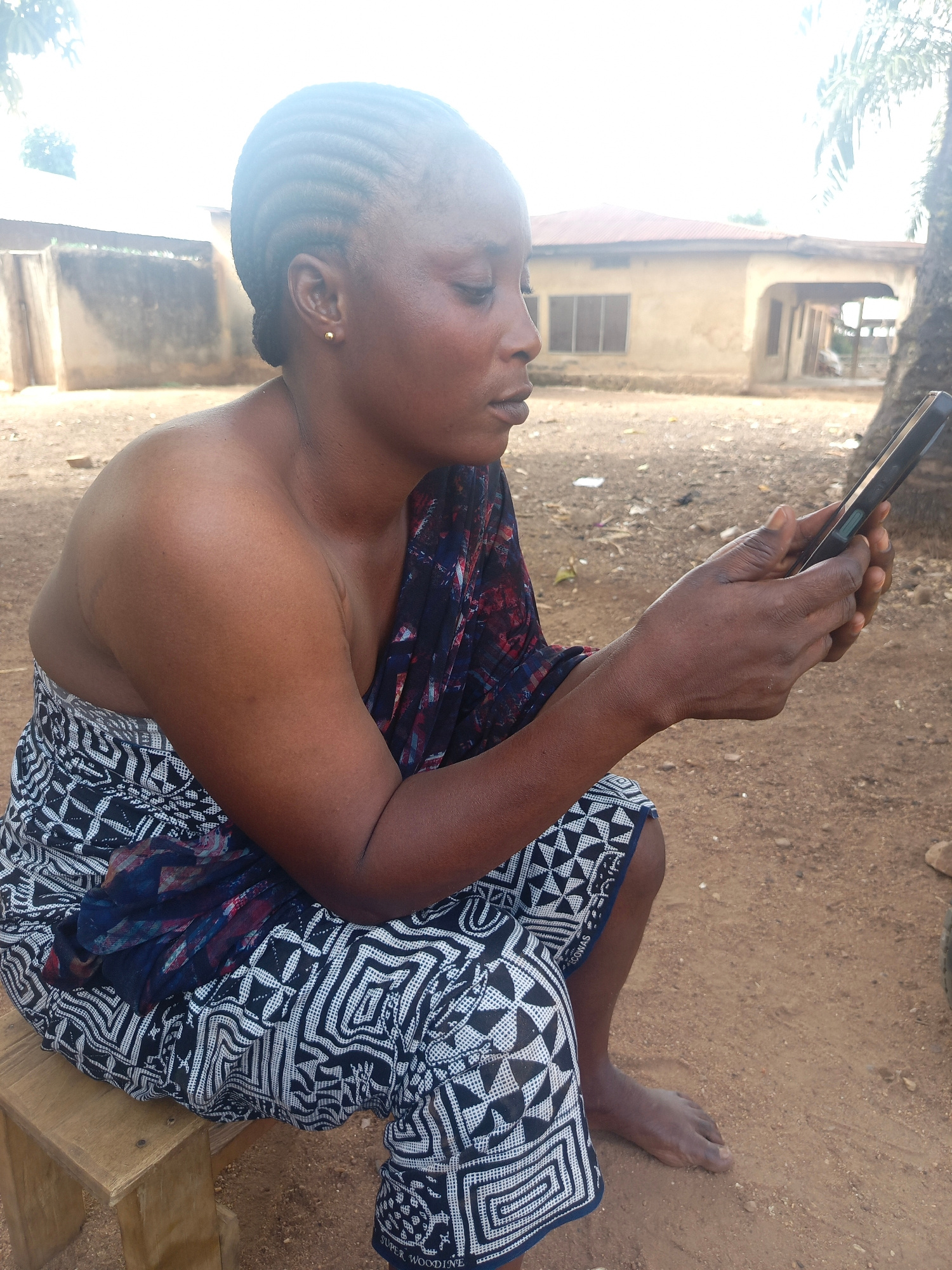 An adult woman with dark skin and braided hair, wearing a patterned garment and a shawl, sits on a small wooden stool. She is holding a smartphone and looking at it intently. The setting appears to be…read more