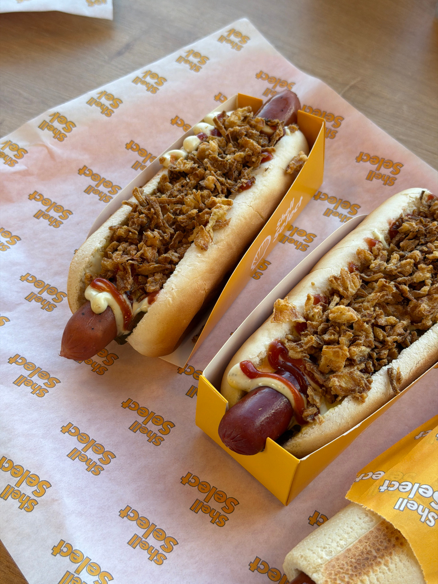 The image shows two hot dogs in yellow "Shell Select" wrappers on a surface covered with "Shell Select" logos. The hot dogs are topped with fried onions, mayonnaise, and ketchup. The location in Zovun…read more