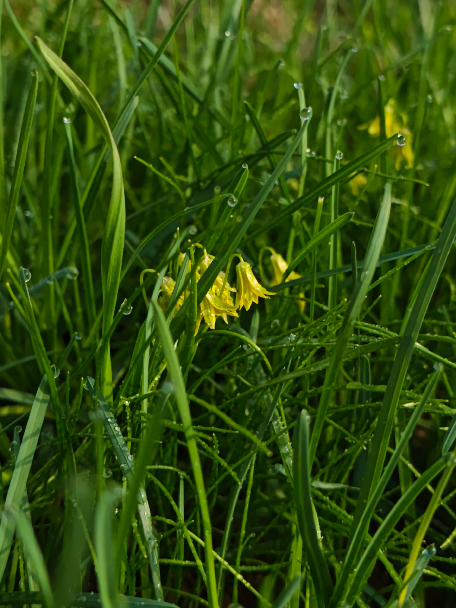 The image shows a close-up view of green grass blades interspersed with small yellow flowers. Water droplets are visible on several of the grass blades. The location, Parkhomivka, Ukraine, is only use…read more