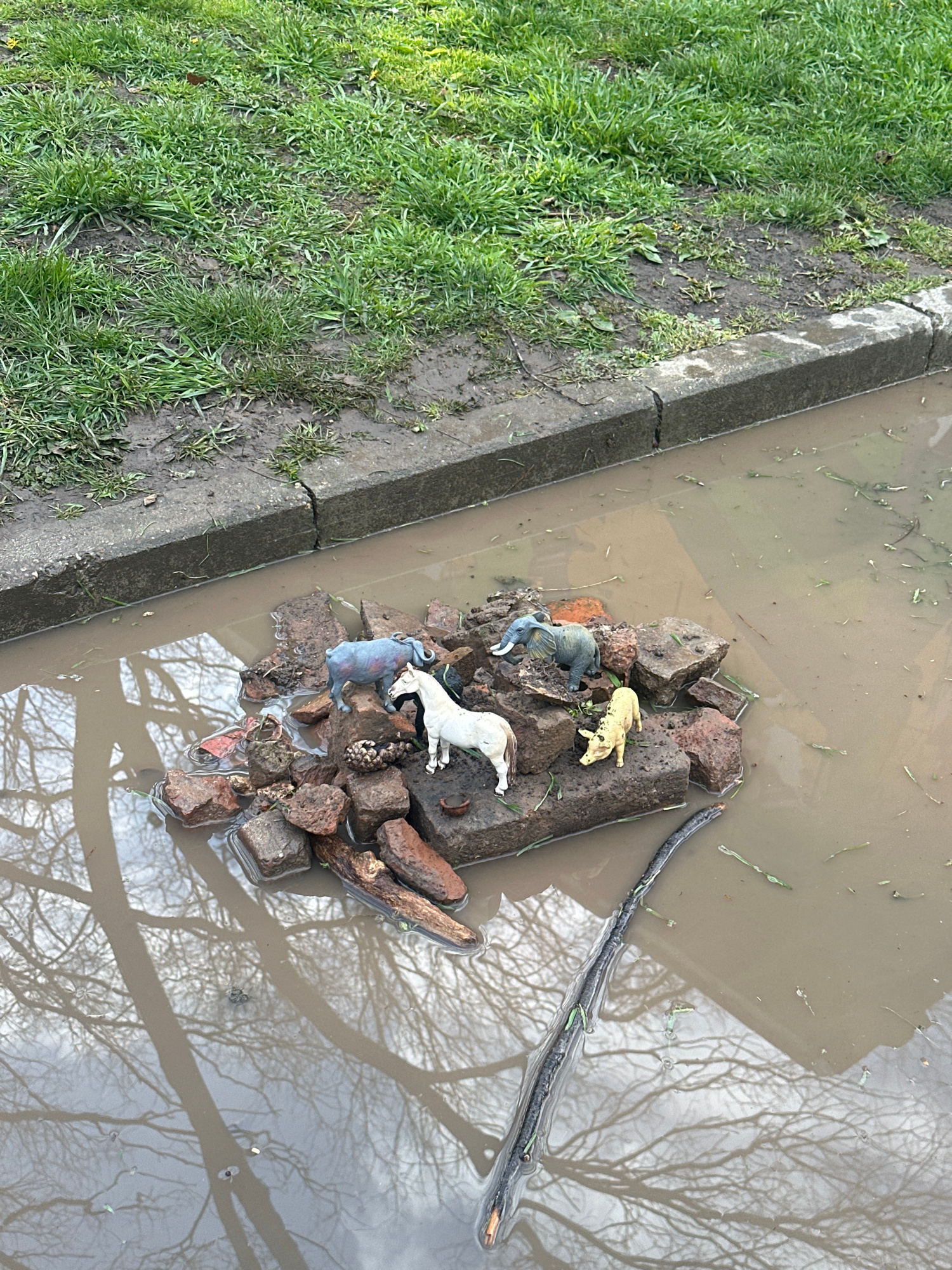 The image depicts a puddle next to a curb, likely formed after rainfall. Within the puddle, a collection of rocks and a piece of wood are arranged, forming a small "island". Several toy animal figurin…read more