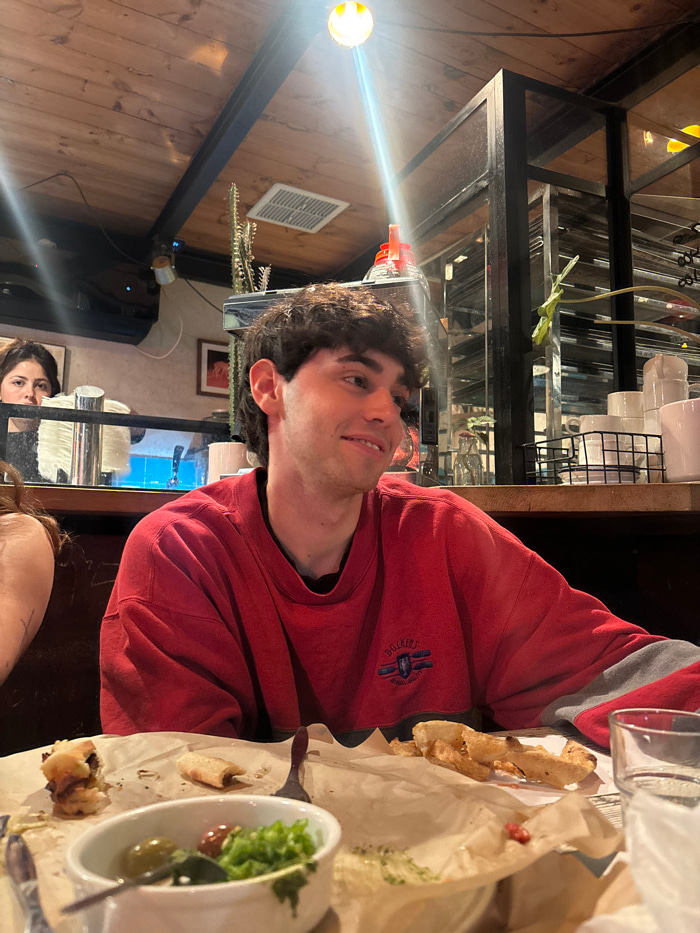 A young man in a red sweater sits at a table with food. He's smiling towards the camera. His sweater has a small logo on the chest. A partially eaten meal with pita bread and a bowl containing lettuce…read more
