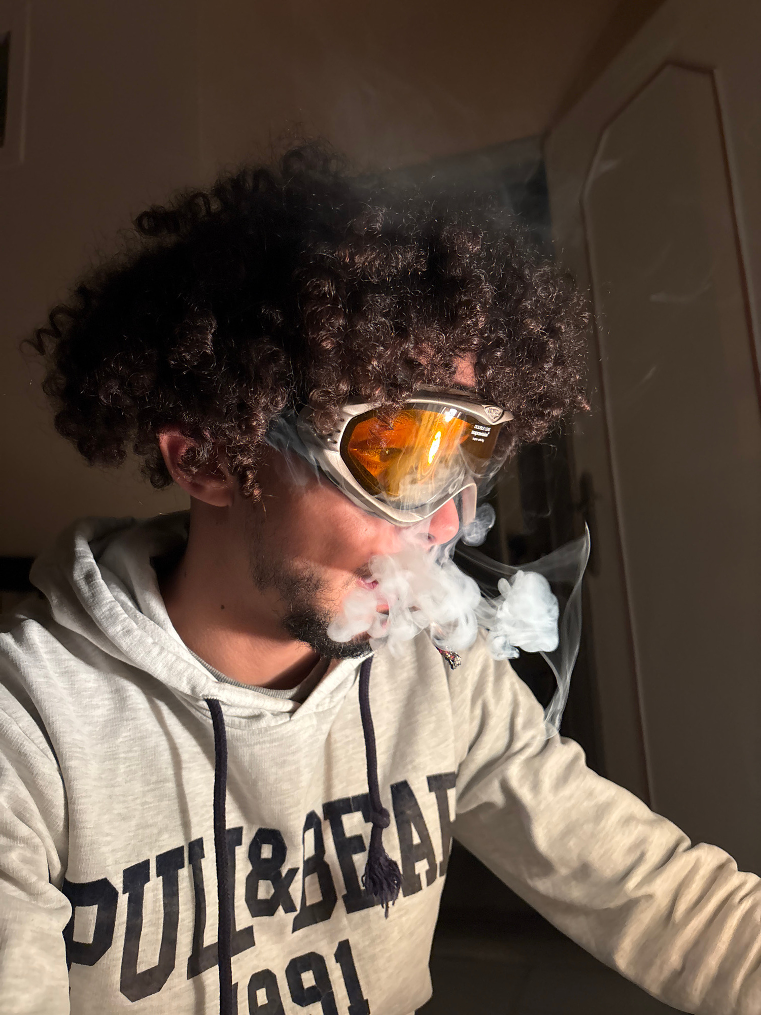 A man with curly hair, facial hair, and wearing orange-tinted goggles is exhaling smoke. He is wearing a grey hoodie with black lettering. The location is likely indoors. The city of Tanger, Morocco,…read more