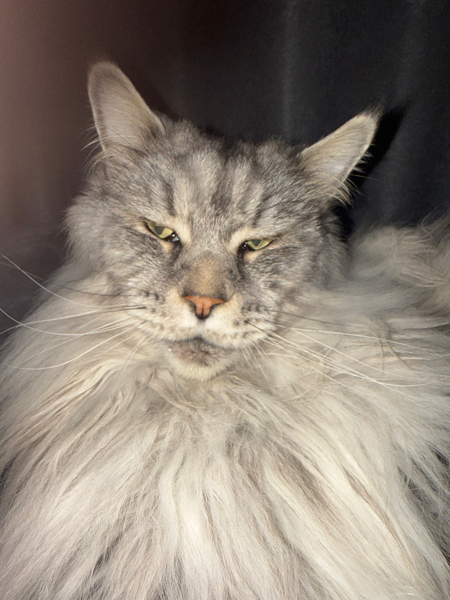The image depicts a close-up of a silver tabby Maine Coon cat. The cat is lying down, its head angled to the left. Its fur is long and fluffy, with distinct silver and gray markings. The cat has a pin…read more