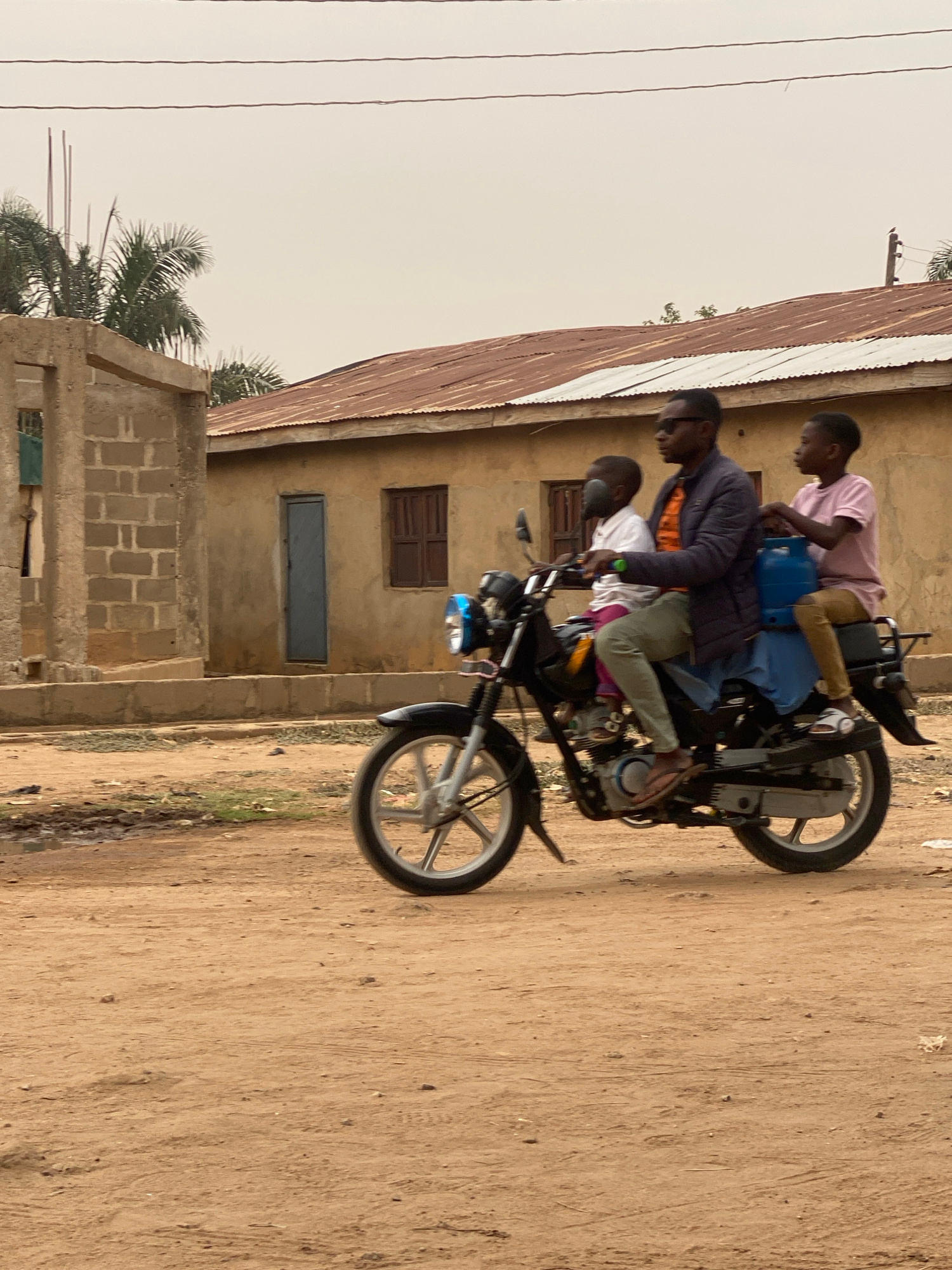 Three people are on a motorcycle on a dirt road in Sabon Tasha, Nigeria. The rider is wearing a navy jacket, and the other two passengers appear to be young men. The passenger in the middle is carryin…read more