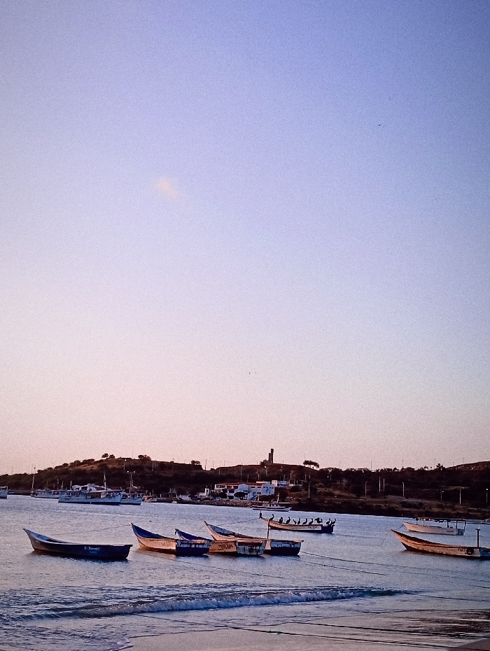 A scenic view of several small boats resting on calm waters. A shoreline, gently sloping down to meet the water, is visible in the foreground. A cluster of low-lying buildings and vegetation dots the…read more