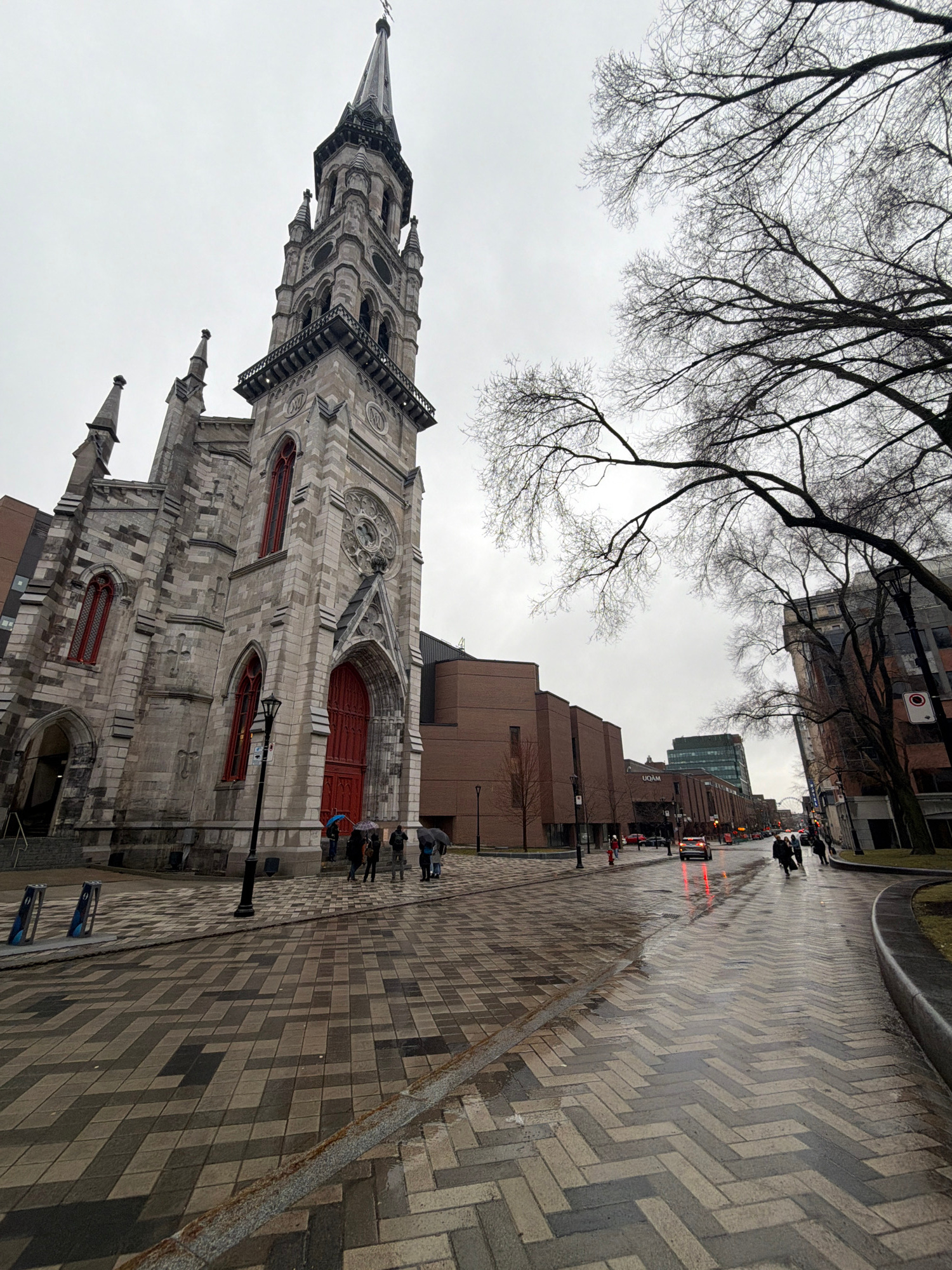 The image shows the Église du Gesù in Montreal, Canada, taken from a low angle on a cloudy day. The church, a prominent Gothic Revival structure, occupies the left side of the frame. A large tree with…read more