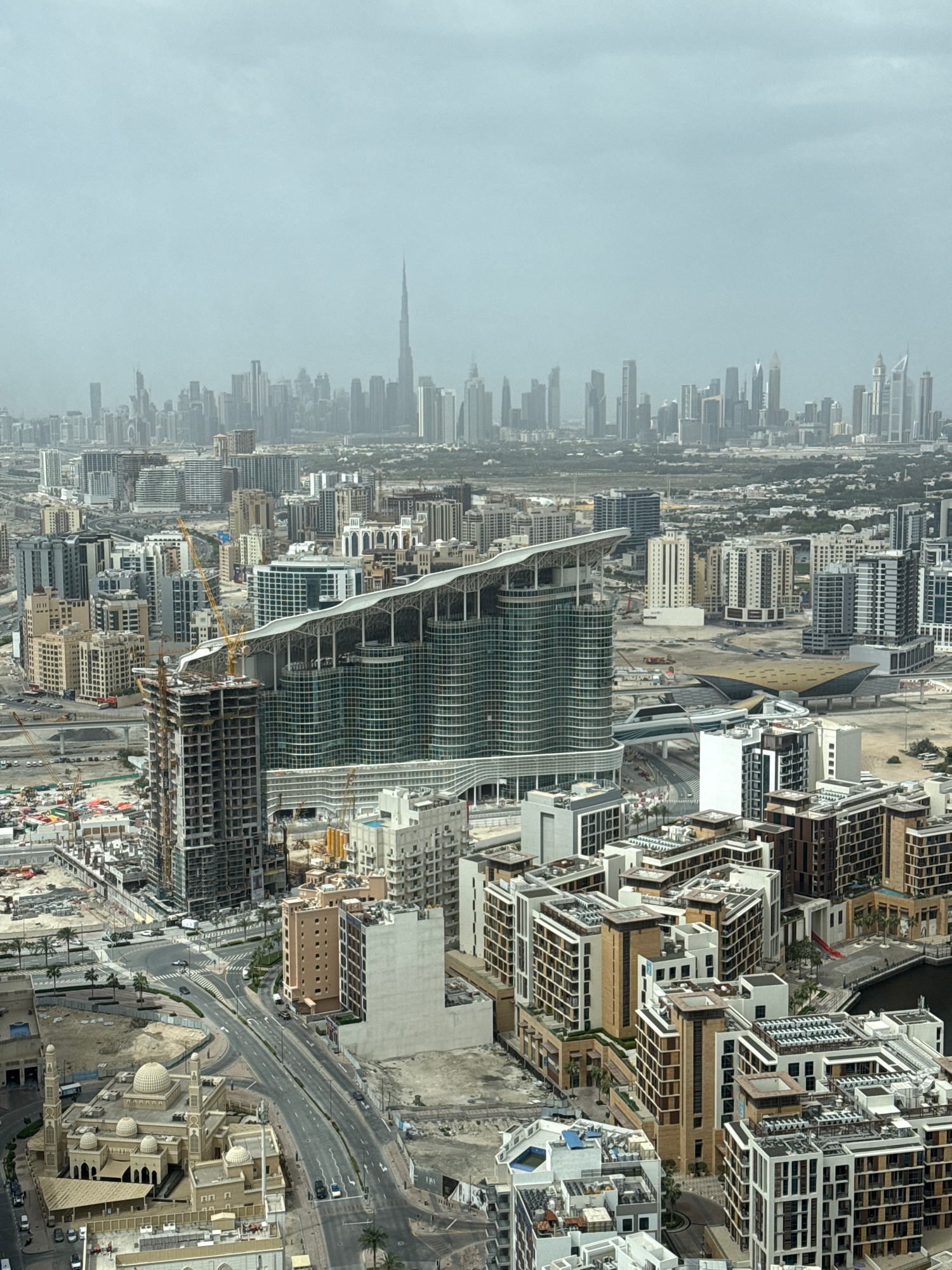 An aerial view of a densely populated urban landscape, dominated by numerous high-rise buildings, under a hazy sky. The architecture is modern, with a variety of shapes and styles evident in the const…read more