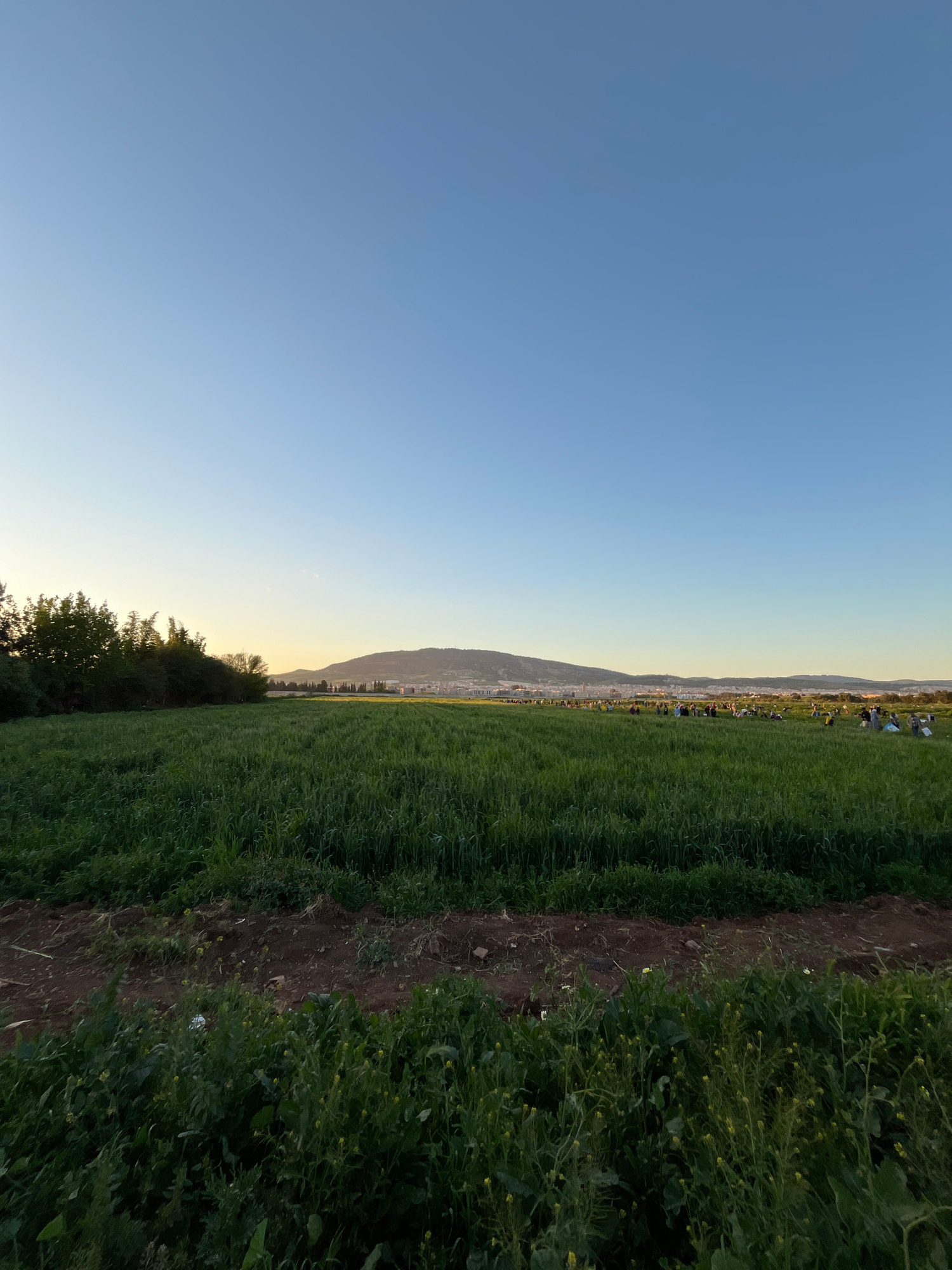 The image presents a landscape with a clear sky transitioning from blue at the top to a lighter shade towards the horizon. A field of green vegetation dominates the right side of the image. A darker p…read more