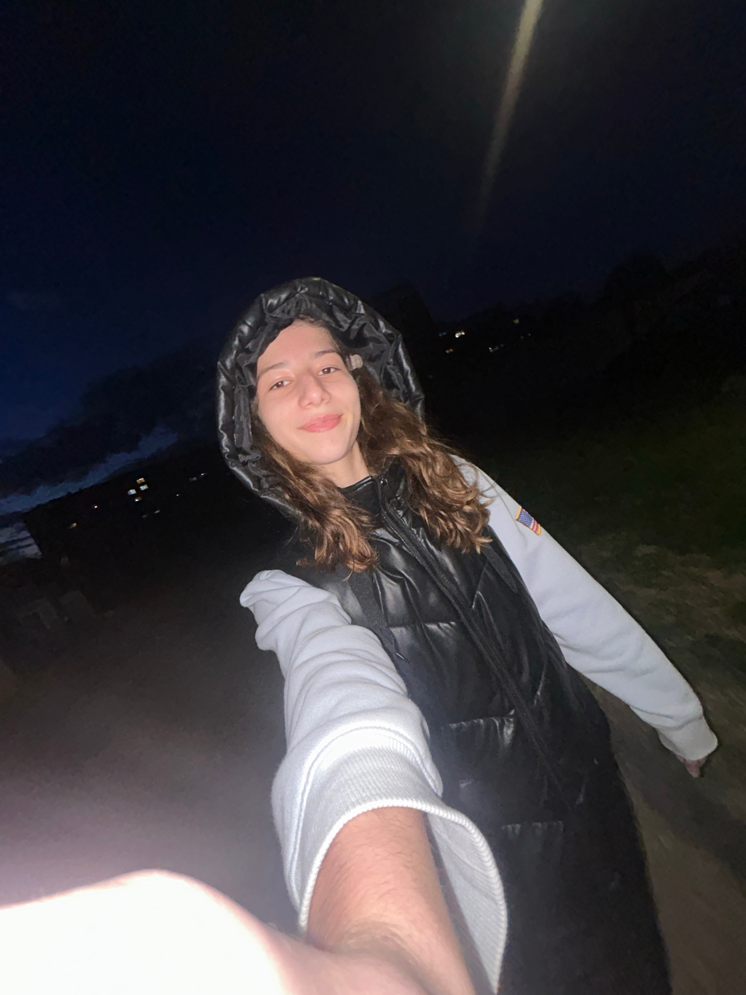 A photograph taken at night in Ruse, Bulgaria, shows a young woman wearing a black hooded vest over a white long-sleeved shirt. She is facing the camera with a slight smile. Part of her arm extends to…read more