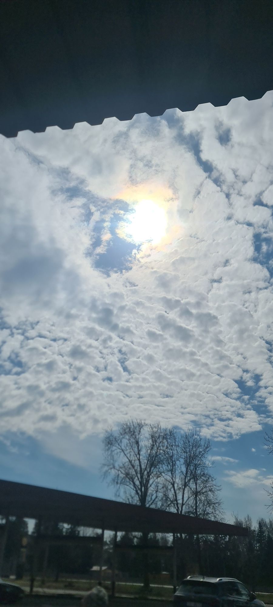 The image captures a bright, mostly cloudy daytime sky, with the sun prominently shining through a break in the clouds. The sun exhibits a luminous glare and slight iridescence, casting colorful hues.…read more
