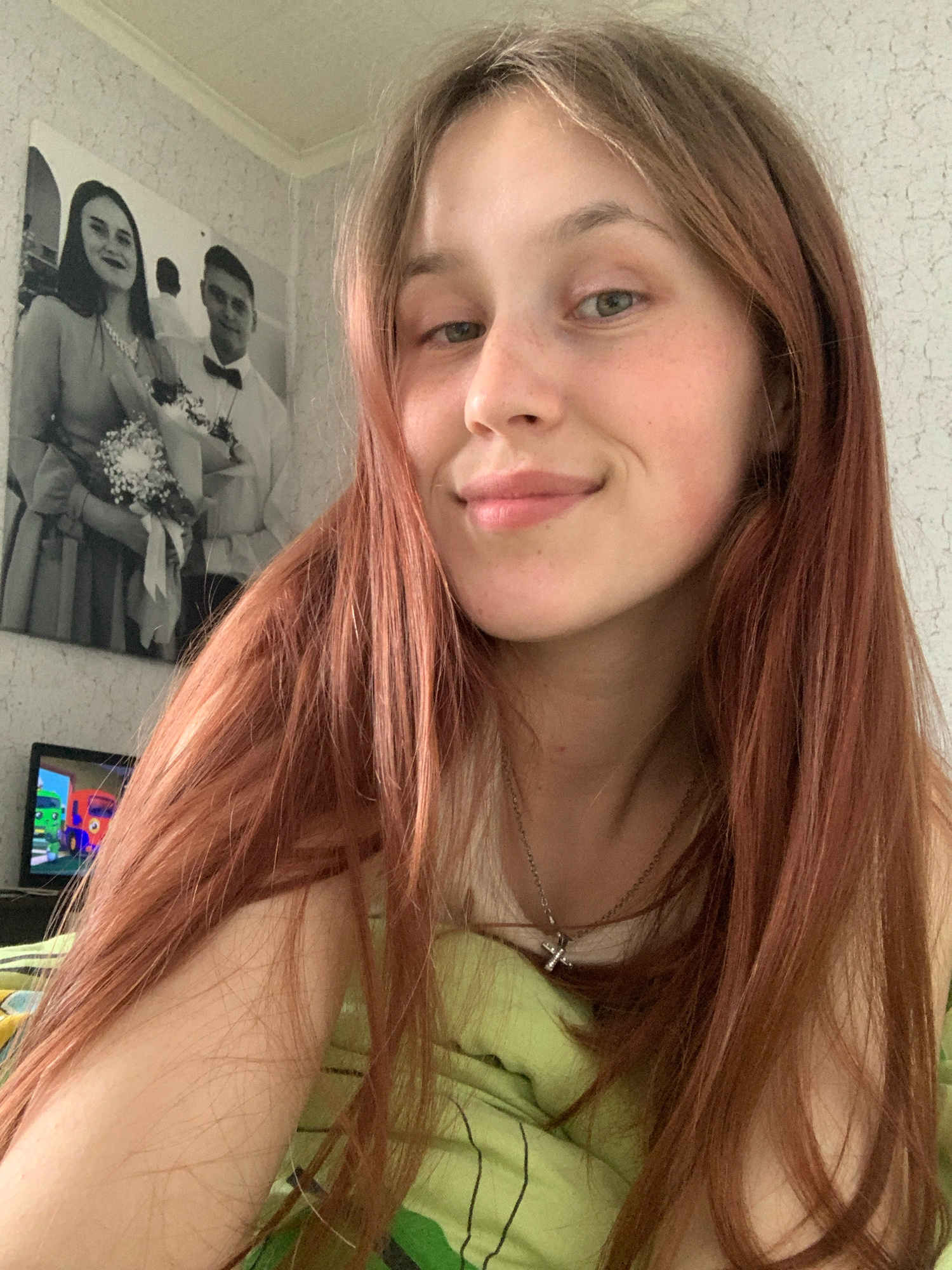 A close-up portrait of a young woman with long, reddish-brown hair. She has fair skin and green eyes. Her head is tilted to the left, and she is looking directly at the camera with a slight smile. She…read more