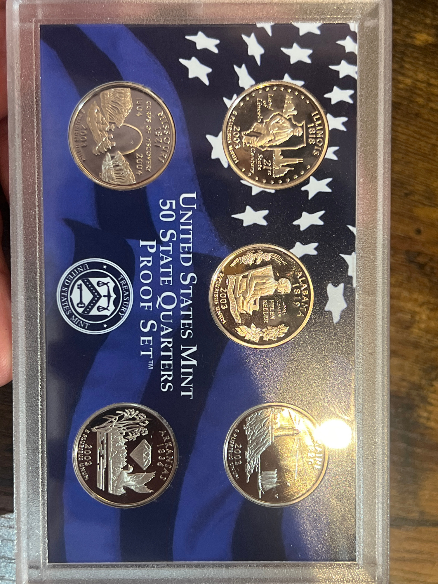 Here is a description of the image: The image shows a "United States Mint 50 State Quarters Proof Set" in a protective case. The set includes five state quarters: Illinois, Alabama, Maine, Missouri,…read more