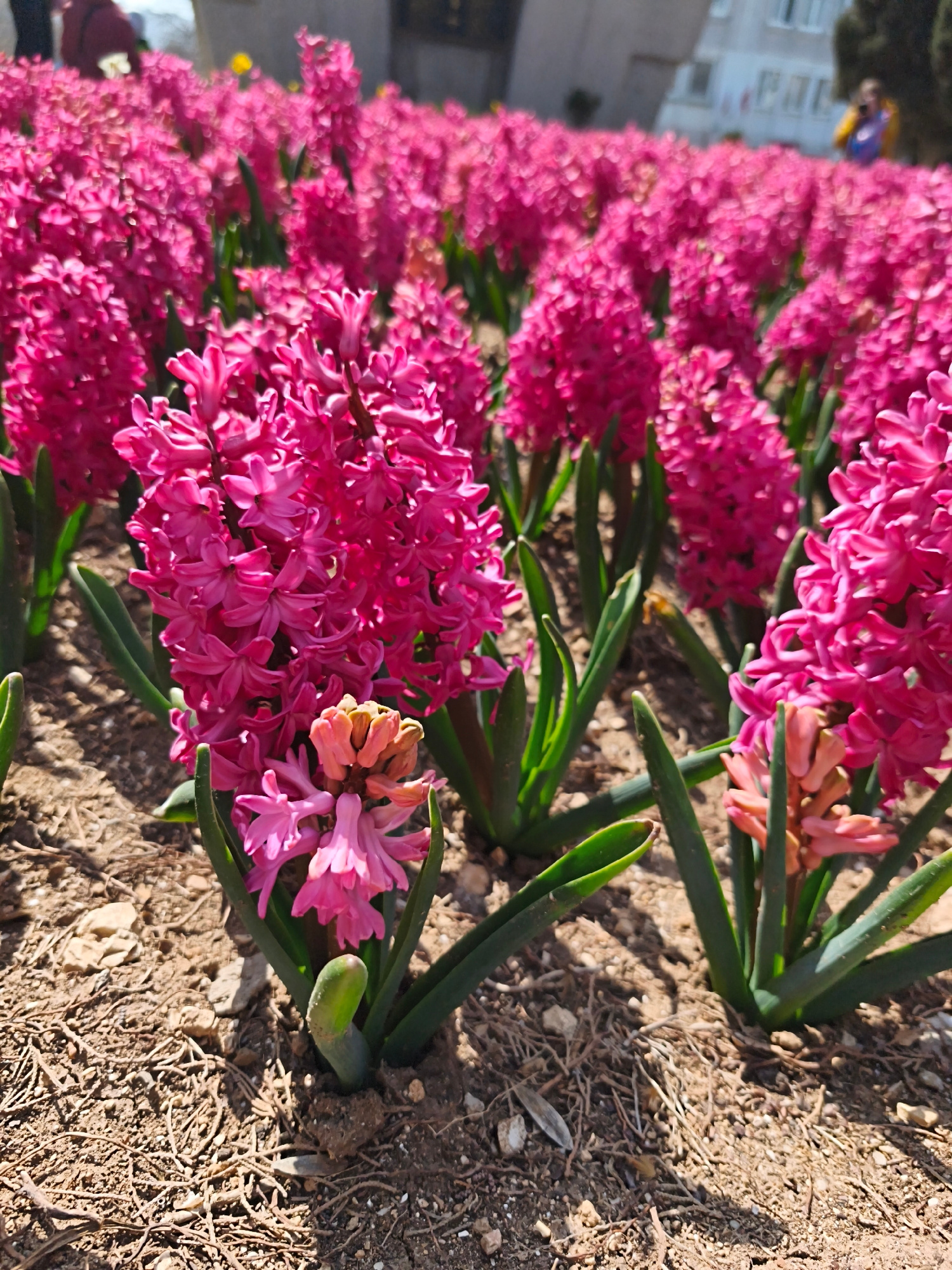 The image displays a close-up view of a large, dense flower bed primarily composed of bright pink hyacinths in Sevastopol, Ukraine. The flowers are in full bloom, with clusters of small, four to six-pā¦read more