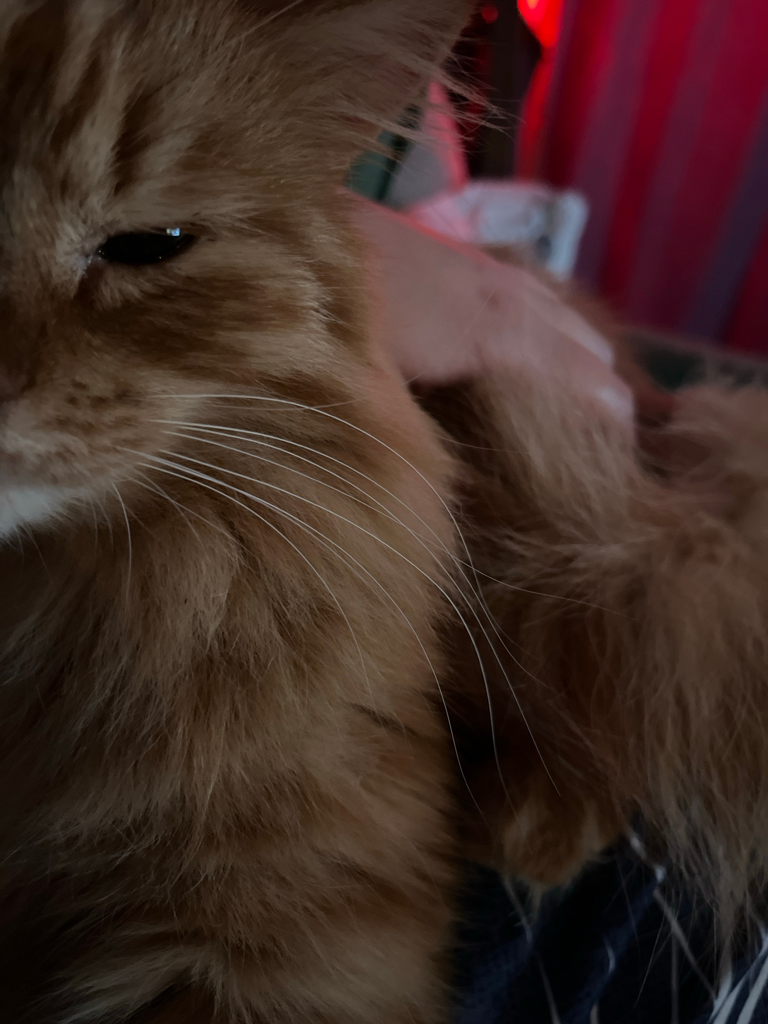 The image depicts a close-up of an orange cat lying down, with its eye partially visible. A hand is visible in the background. The setting includes a blurry red and white background. There is no evide…read more