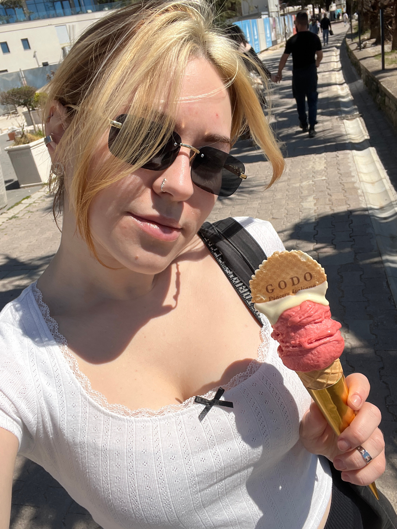 A woman with blonde hair and sunglasses is holding an ice cream cone in front of her. The cone is golden and contains pink ice cream with a circular wafer. The wafer has the word "GODO" printed on it.…read more