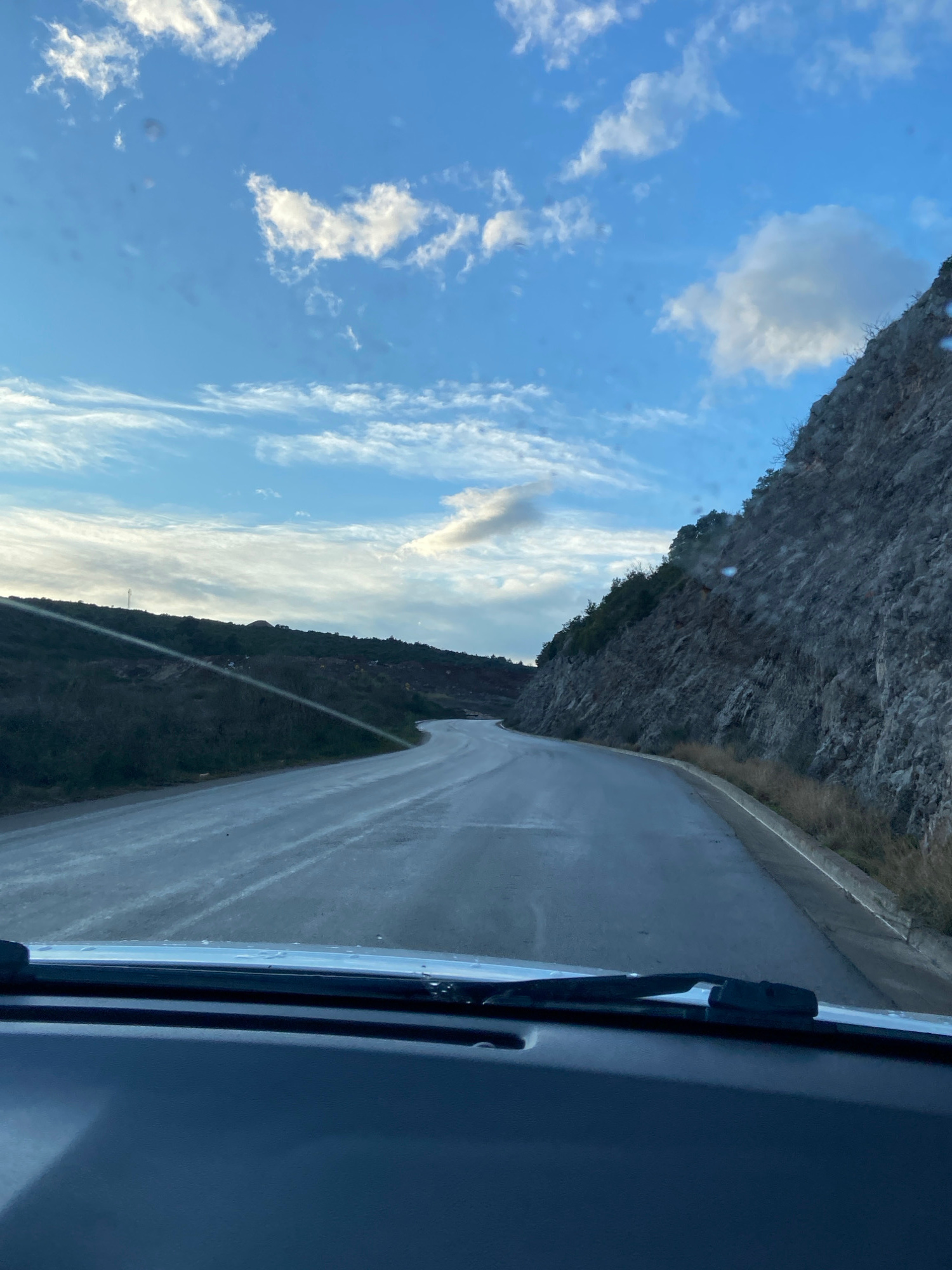 The image shows a view from inside a vehicle, looking out onto a wet road that curves along the base of a rocky cliff. A blue sky with scattered clouds is visible above the cliff. The vehicle's windsh…read more