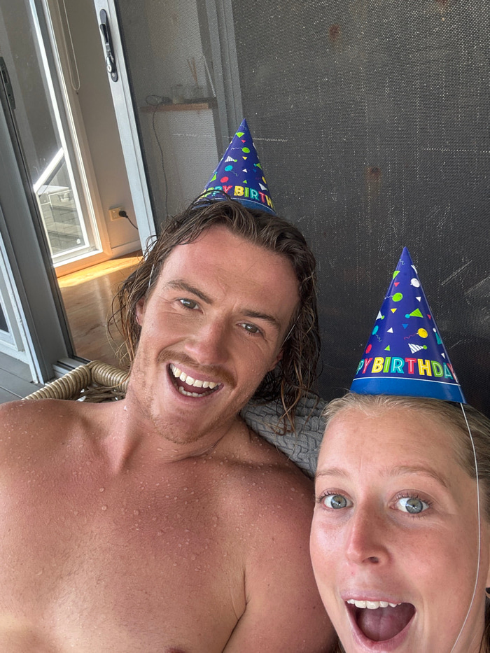 Two individuals, likely a couple, pose close together wearing blue birthday hats. A man with wet, blonde hair smiles widely. He is shirtless, and droplets appear on his skin. Next to him is a woman wi…read more