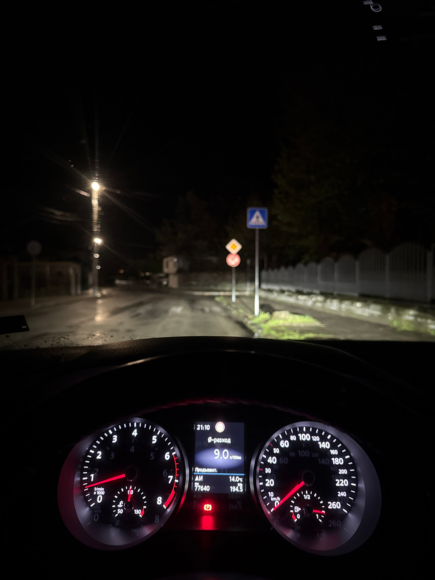 The image depicts a nighttime view from inside a vehicle, likely a car, moving along a street. The dashboard is prominently featured, displaying the speedometer at approximately 15 km/h and the RPM ga…read more