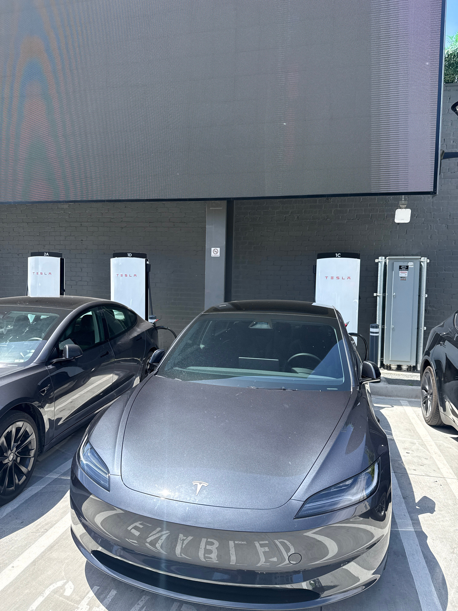 The image captures an outdoor scene at what appears to be a Tesla Supercharger station. Two gray Tesla cars are parked and charging, with one prominently featured in the foreground, partially obscurin…read more