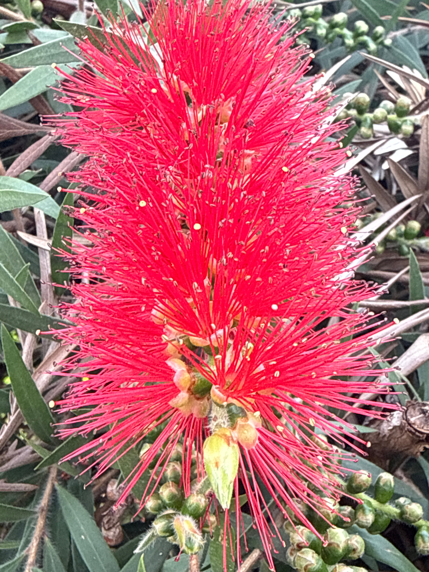 A close-up shot depicts a vibrant red Bottlebrush flower, characterized by its cylindrical shape and numerous long, slender stamens giving it a brush-like appearance. Yellow pollen granules are scatte…read more