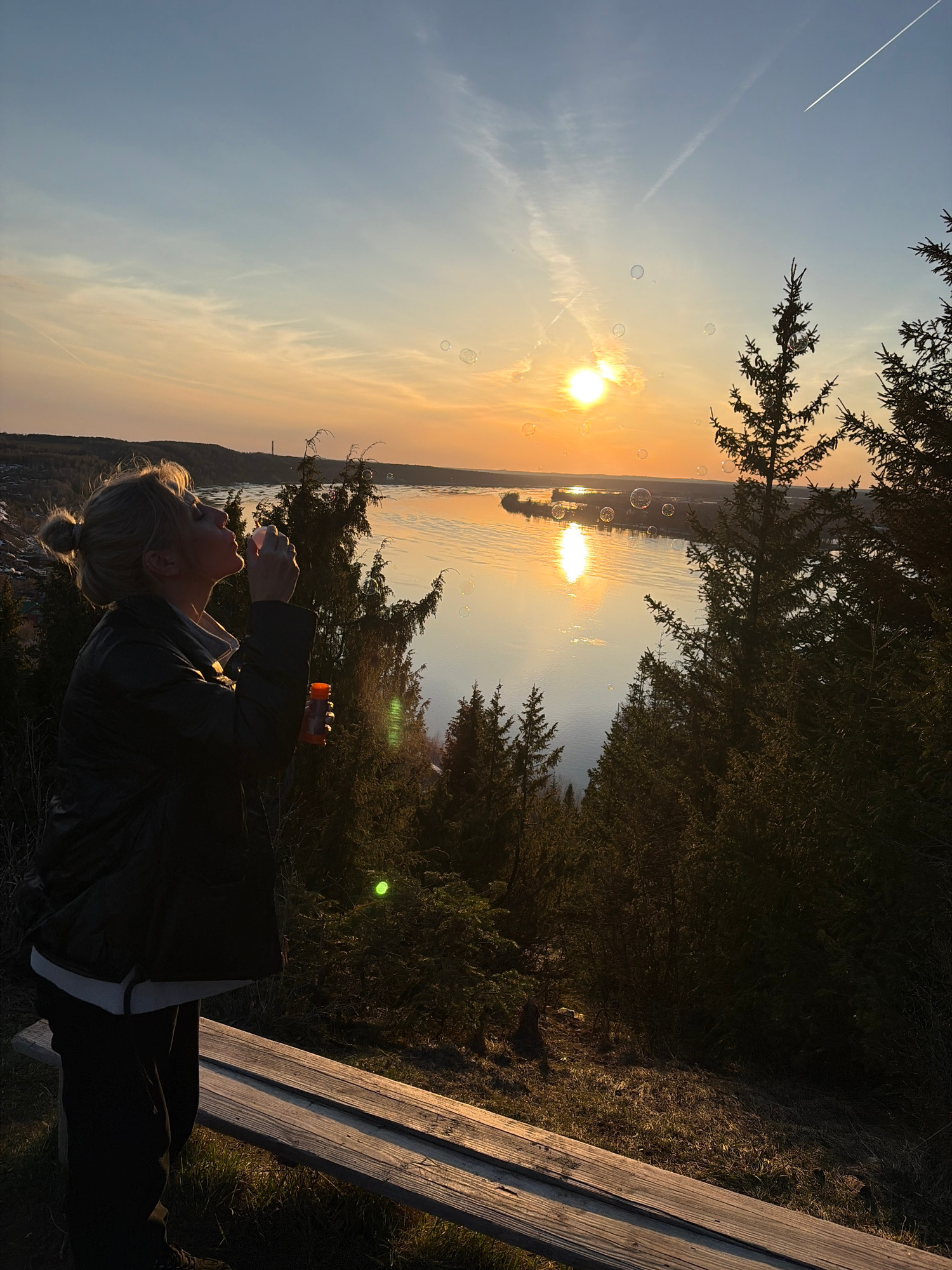 A person is making bubbles while sitting on a wooden bench in Ольховка, Russia. The sun is setting over a body of water. The sky is a mix of blue and orange. Trees line the shore. There are many bubbl…read more
