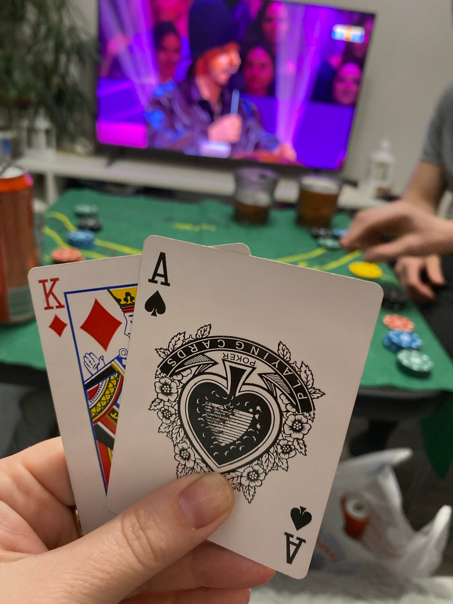 Here is a detailed description of the image: **People:** * A person is holding playing cards in their hand. * Another person is visible in the background at the poker table. * People are also…read more