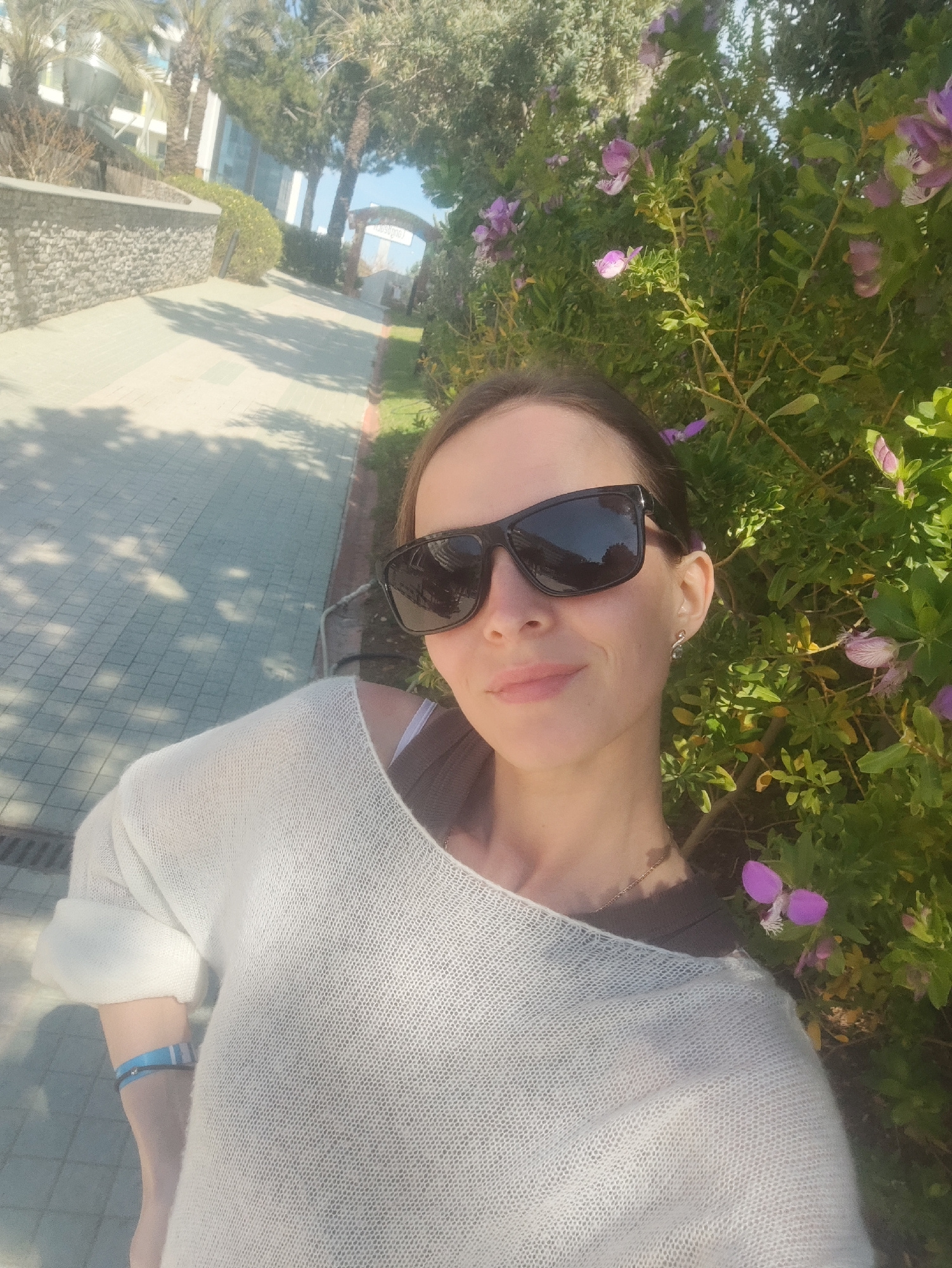The photograph depicts a woman outdoors, likely on a bright, sunny day in Alanya, Turkey. She is wearing dark sunglasses and a light-colored, off-the-shoulder sweater. She appears to be standing or po…read more