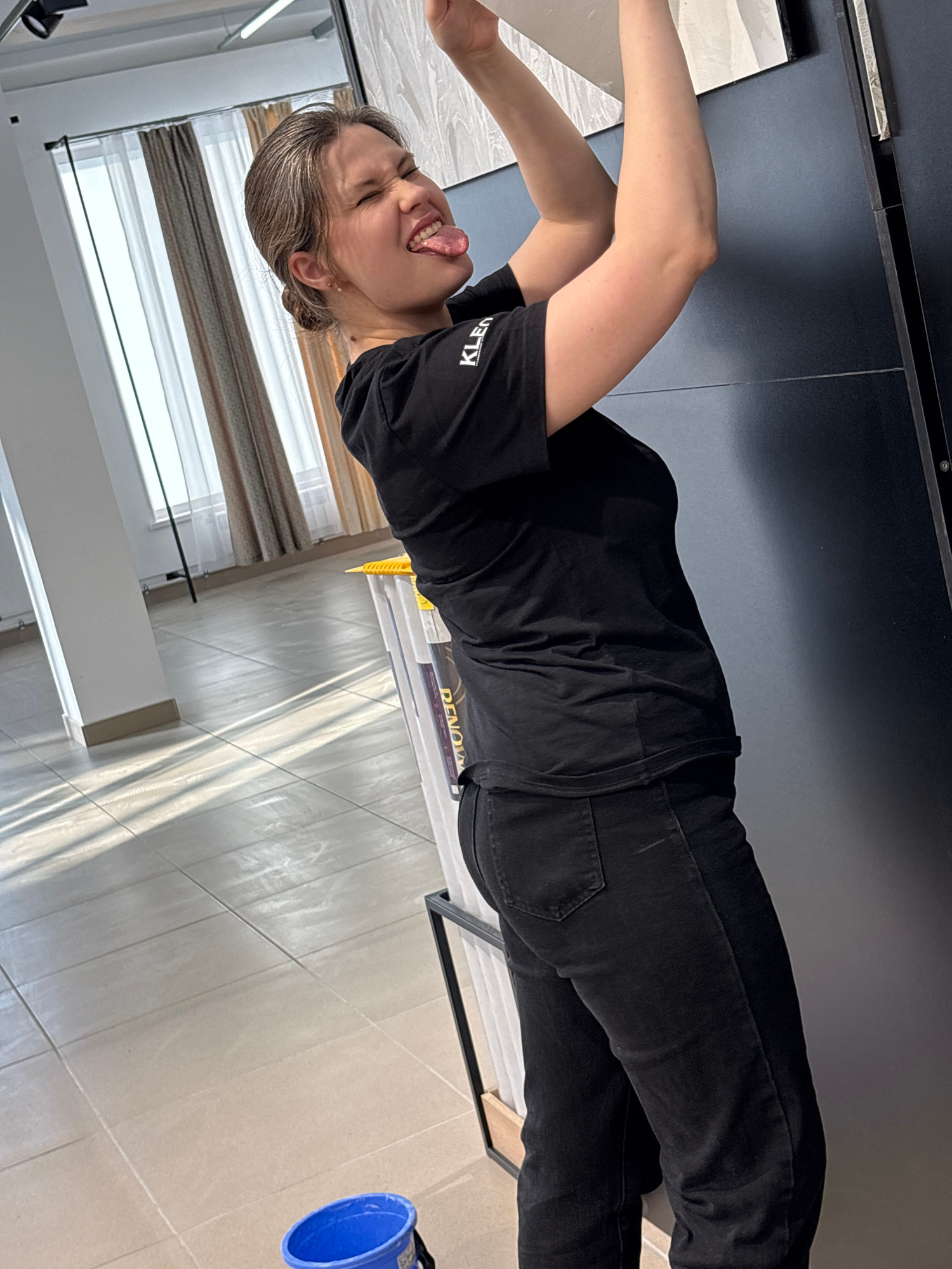 A woman with graying hair is sticking her tongue out and lying on a black surface, possibly a table or counter. She is wearing a black t-shirt with the word "KLEEN" printed on it and black jeans. The…read more