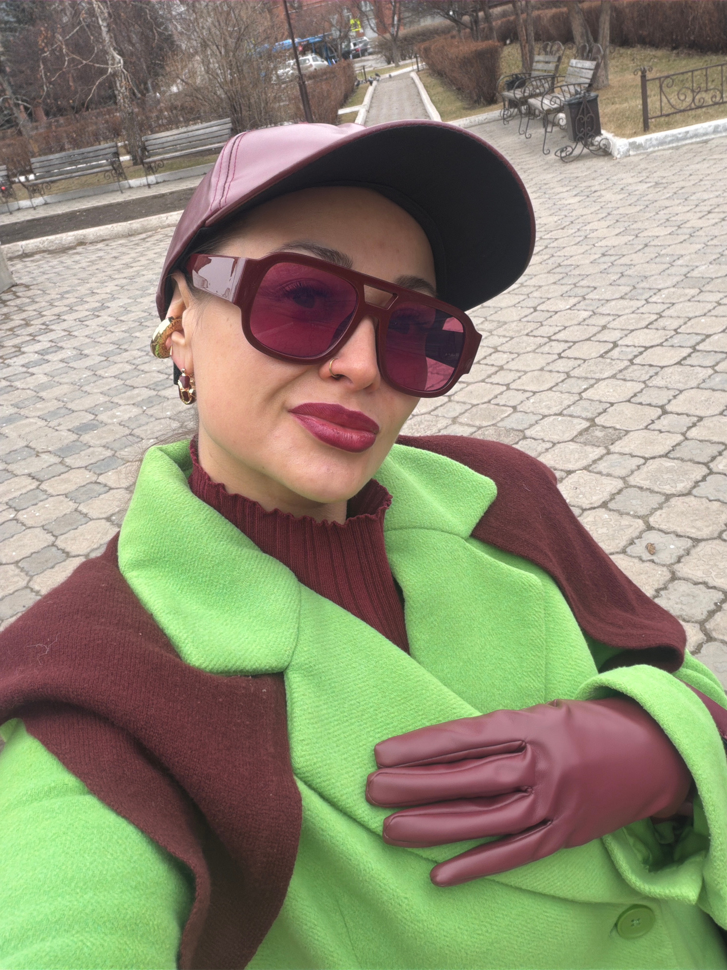 The image shows a woman wearing a dark burgundy leather cap, matching sunglasses and gloves, a burgundy turtleneck sweater, and a lime green coat with burgundy trim. She is outdoors on a paved area, p…read more