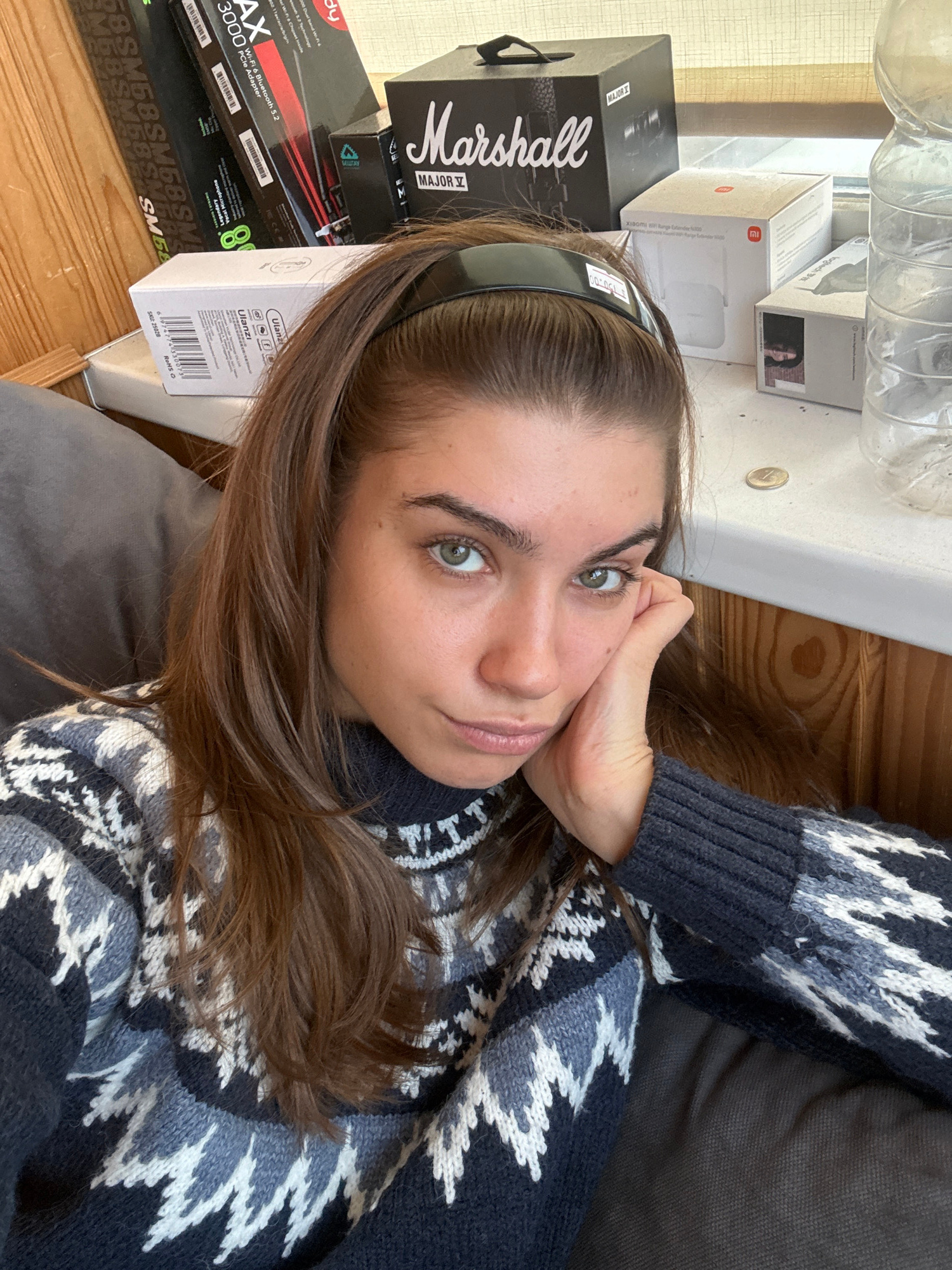 A woman with brown hair and green eyes wearing a patterned navy and white sweater is lying down, her head resting on a pillow. She is wearing a black headband. Her right hand is touching her cheek. S…read more