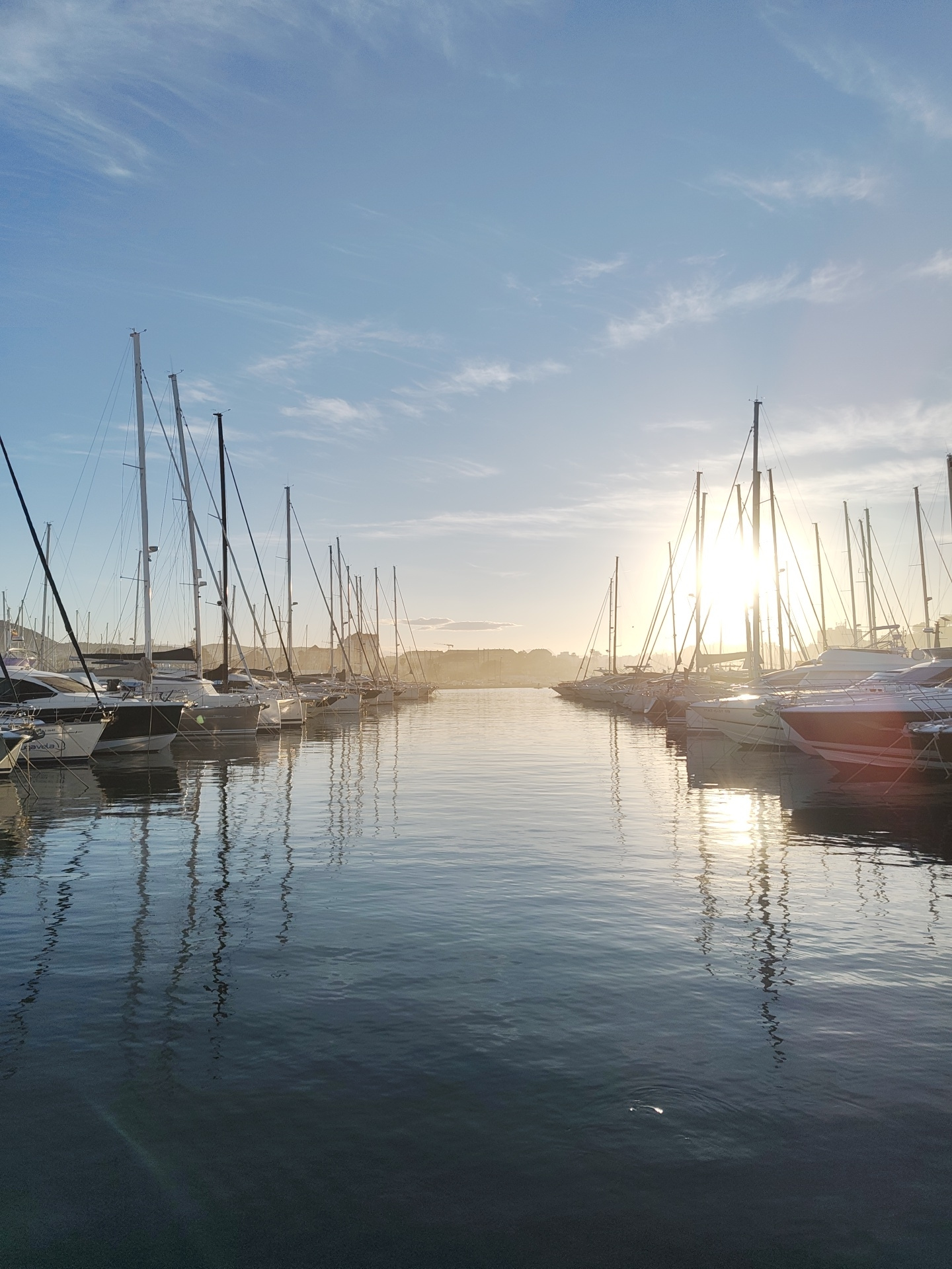 The image captures a marina in Dénia, Spain, at sunrise or sunset. Numerous sailboats and yachts are docked along both sides of a narrow waterway. The sun shines brightly in the distance, between the…read more