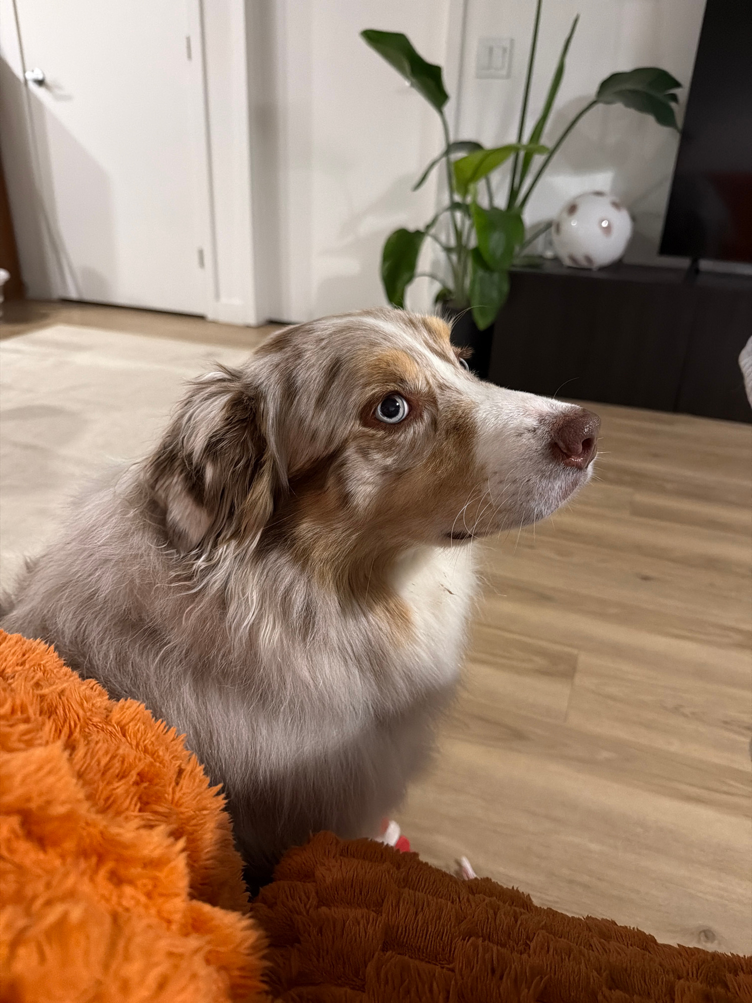 A medium shot depicts a dog, possibly an Australian Shepherd, lying on a tan surface adjacent to an orange, textured object and a light-colored object that appears to be a sofa. The dog is looking upw…read more