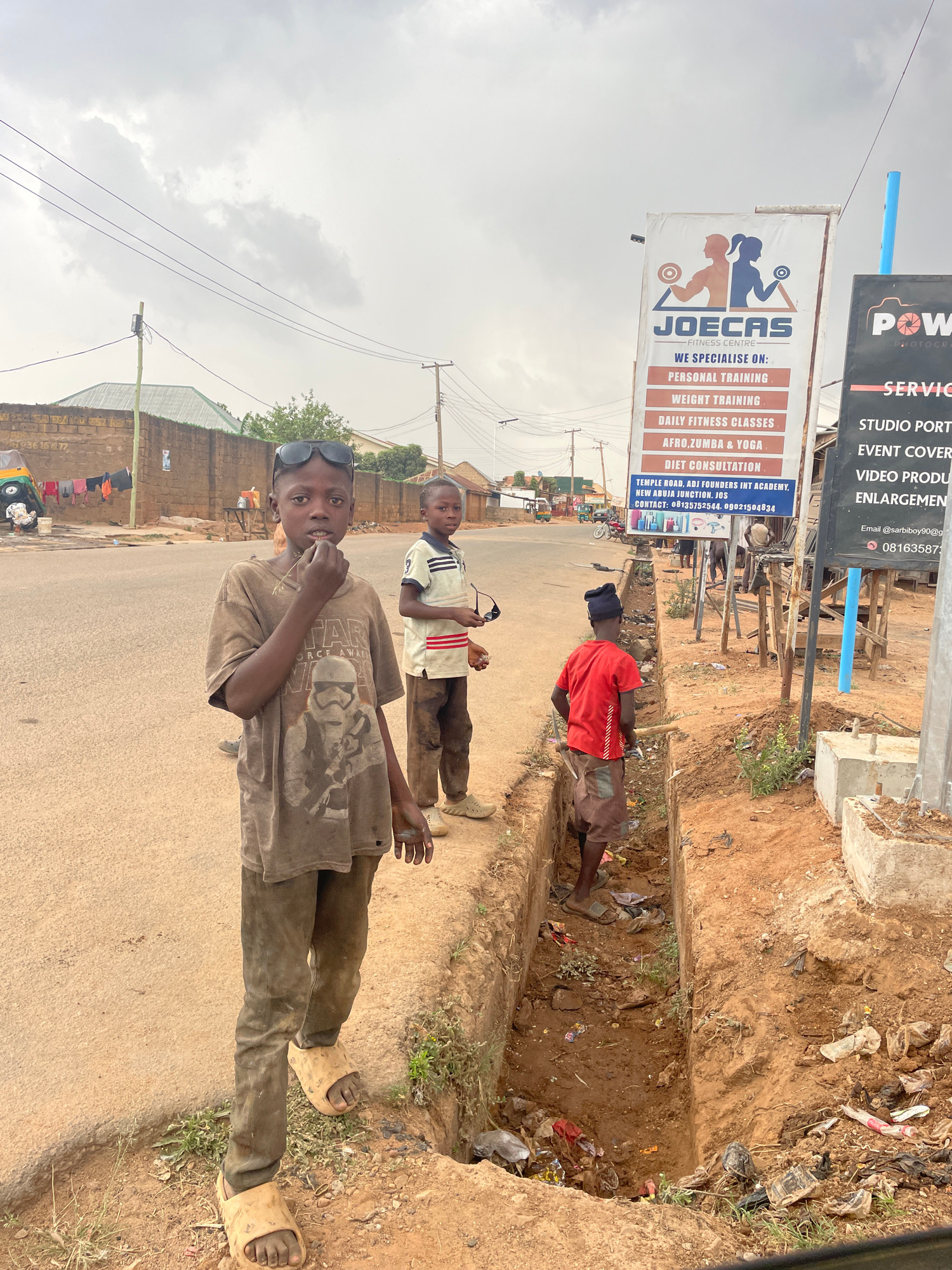 Three boys stand on a street in Jos, Nigeria. The foreground boy wears a brown shirt with a graphic, brown pants, and beige sandals. He also has sunglasses perched on his head and is holding something…read more