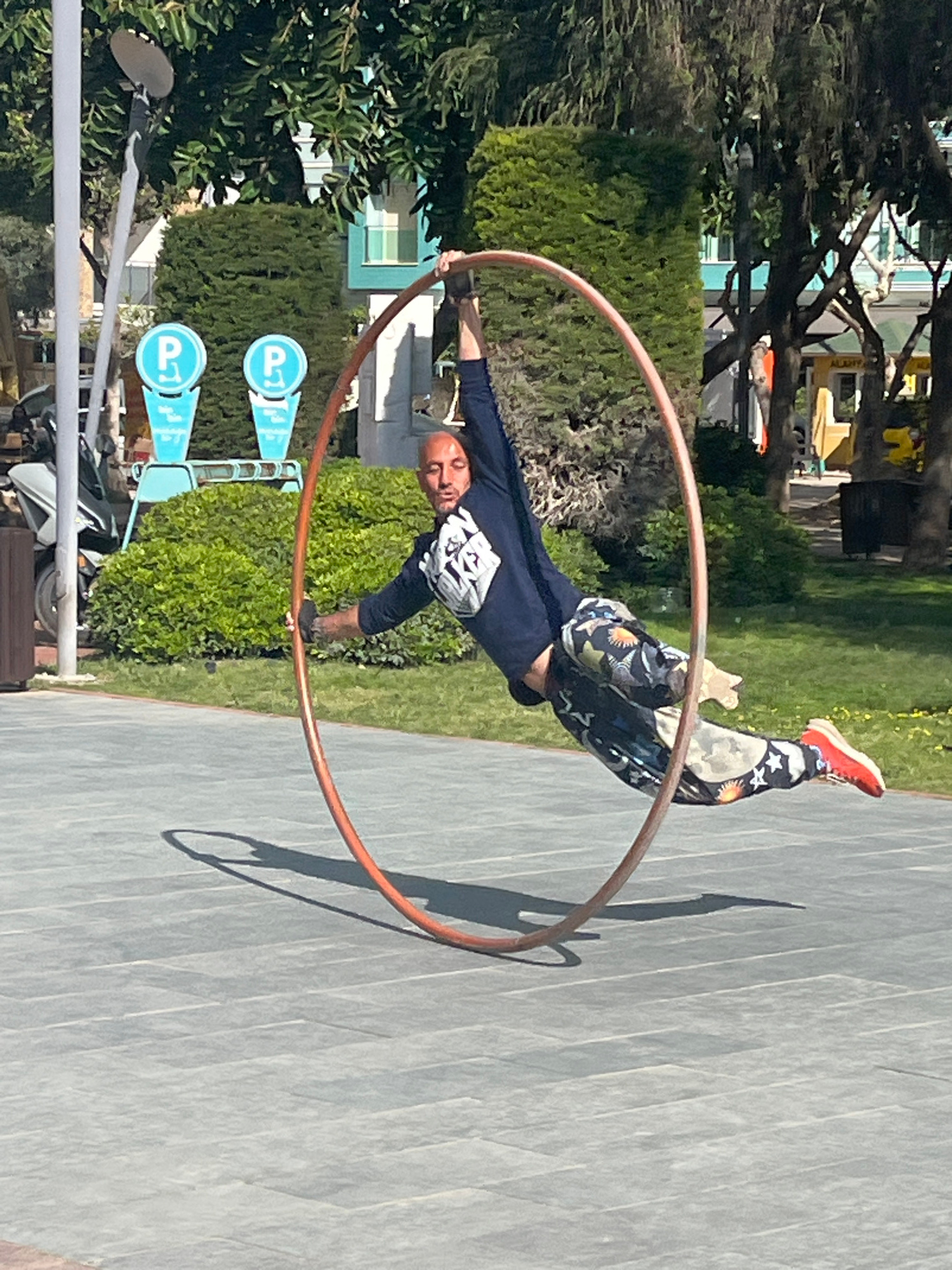 A man is performing a balancing act inside a copper hoop in an outdoor setting. He wears a navy blue long-sleeved shirt, patterned leggings with stars and celestial designs, and red athletic shoes. Hi…read more