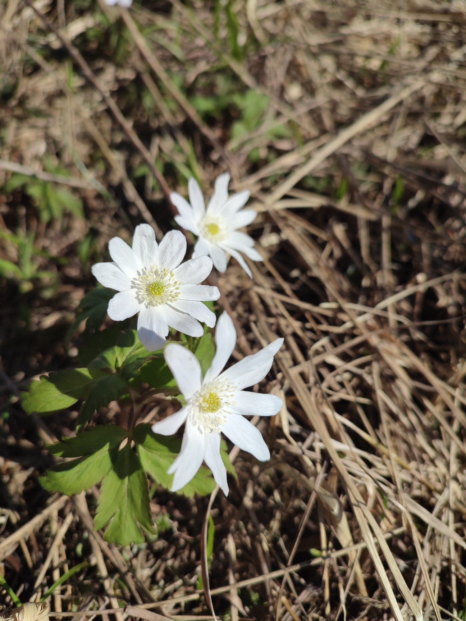The image depicts three white anemone flowers with yellow centers blooming among dried grass and green leaves. The location is Unknown, Unknown. The flowers are in focus, while the background is sligh…read more