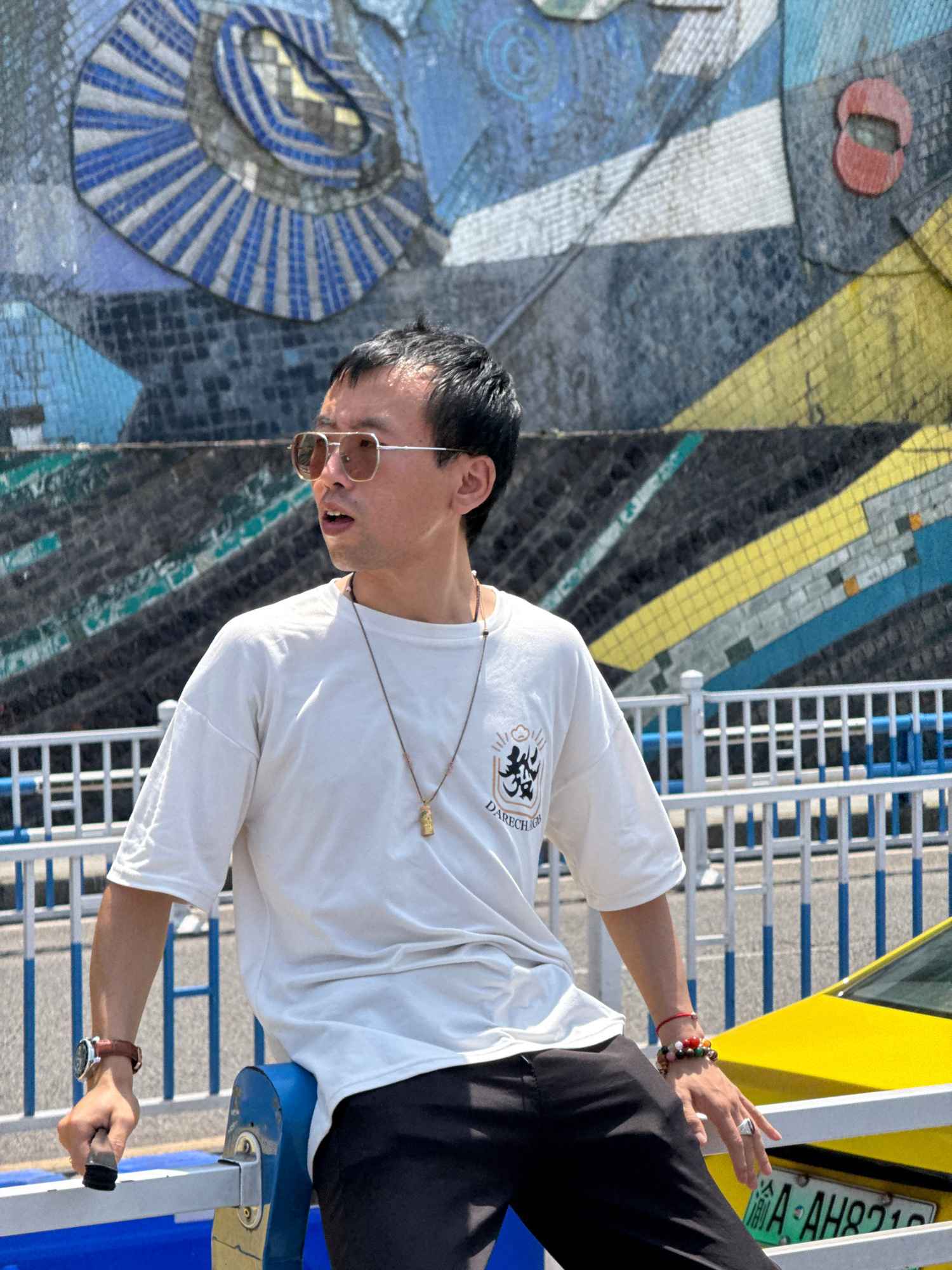 The image features a young person, likely male, posing or engaging with outdoor equipment in what appears to be an urban setting within Yuzhong District, China. He wears a white long-sleeved t-shirt w…read more