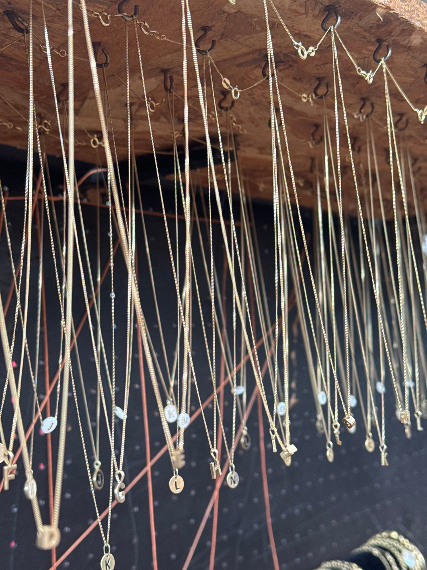 The image shows a close-up of numerous gold-colored necklaces suspended on a wooden frame and extending towards a black surface. The necklaces have various letter pendants attached. The wooden frame i…read more