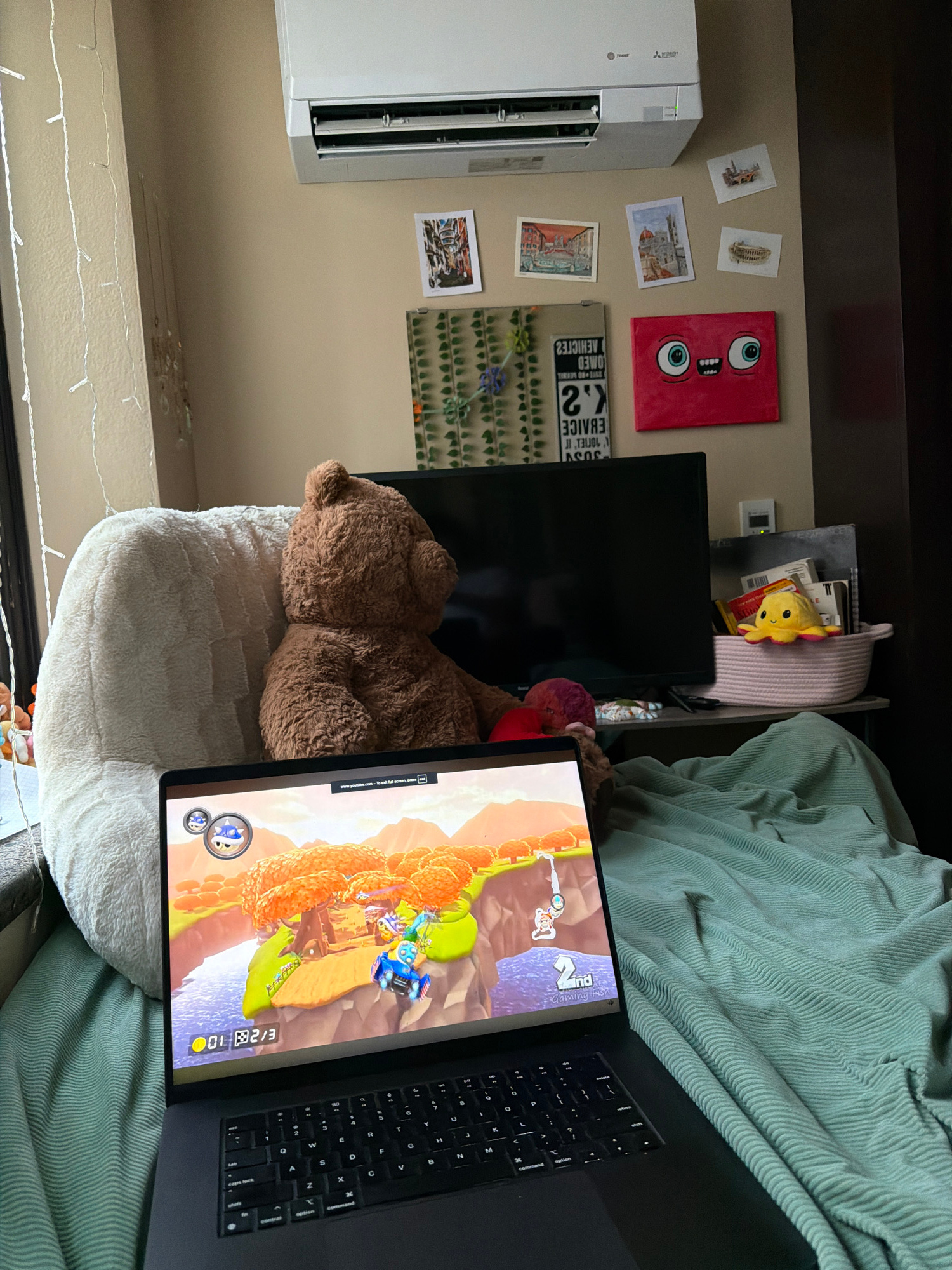 A laptop is positioned on a bed with a green blanket, displaying a video game scene featuring cartoon characters racing on a colorful track. A brown teddy bear sits against a white, fluffy cushion. In…read more