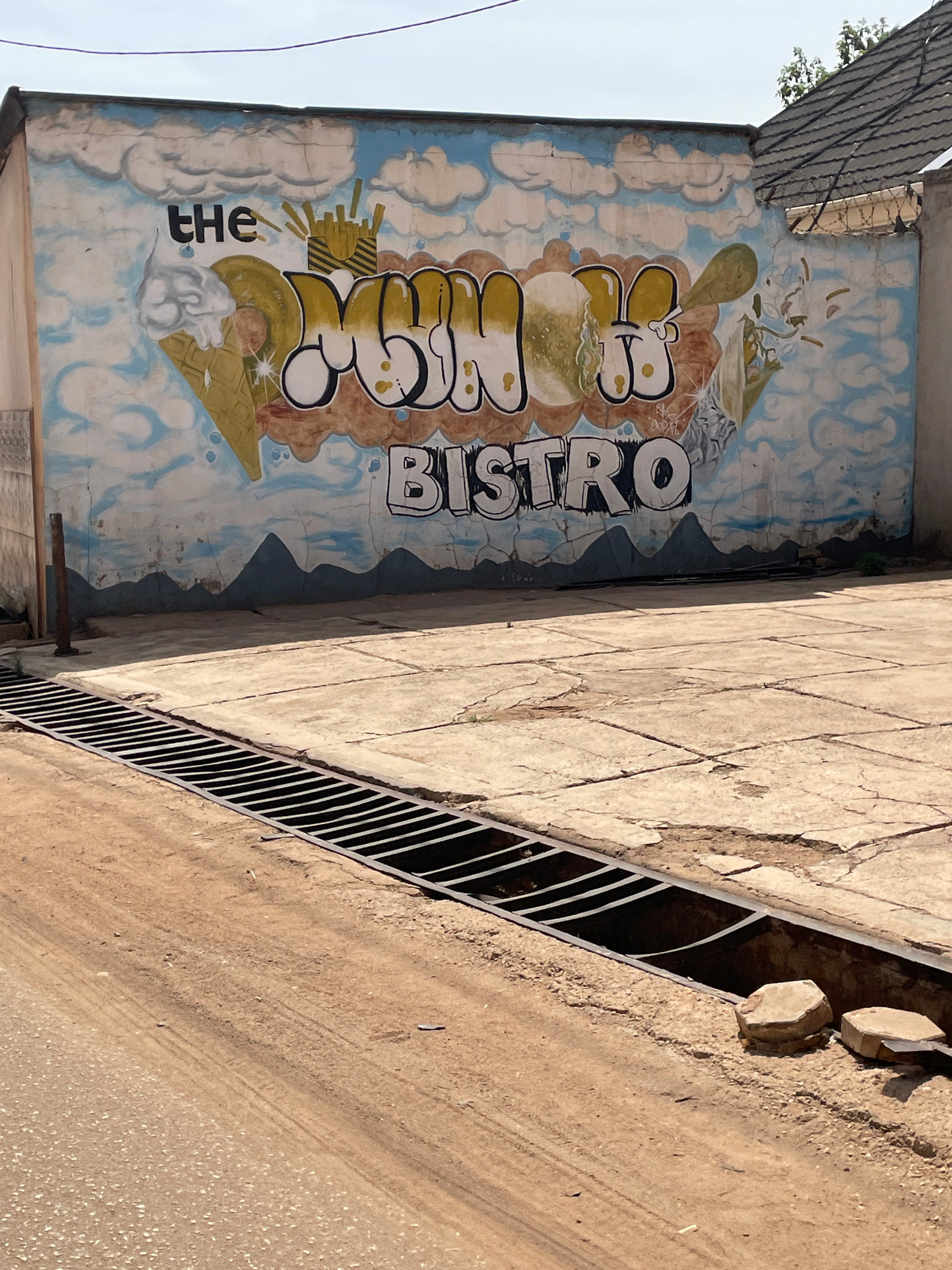 The image, rotated counter-clockwise, depicts a vibrant street art mural on a building wall, likely for a food establishment called "THE COOKIE BISTRO." The mural's background is a bright blue sky fil…read more