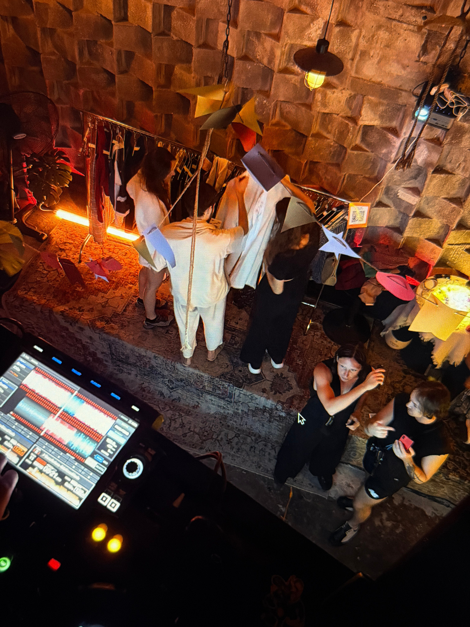 This indoor shot taken from above captures a gathering of several individuals in what appears to be a bar or lounge. The location is possibly in Đà Nẵng, Vietnam. Two individuals are situated in the u…read more